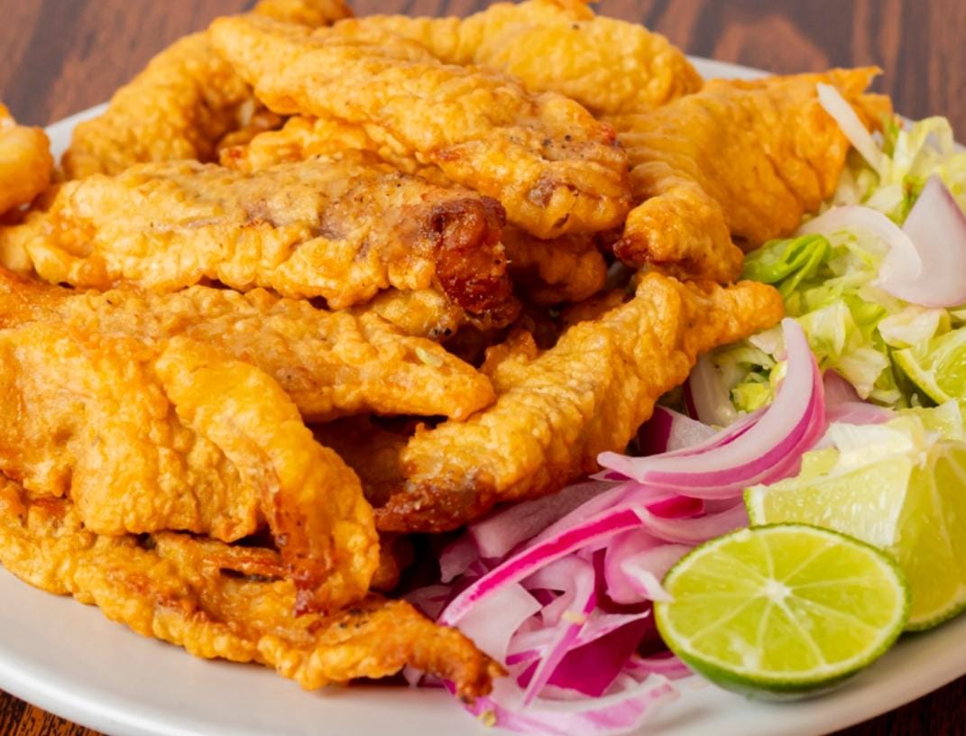 Media orden de pescado capeado, servido a granel, lechuga, limones y cebolla aparte, acompañado de tortillas de maíz 100 g.