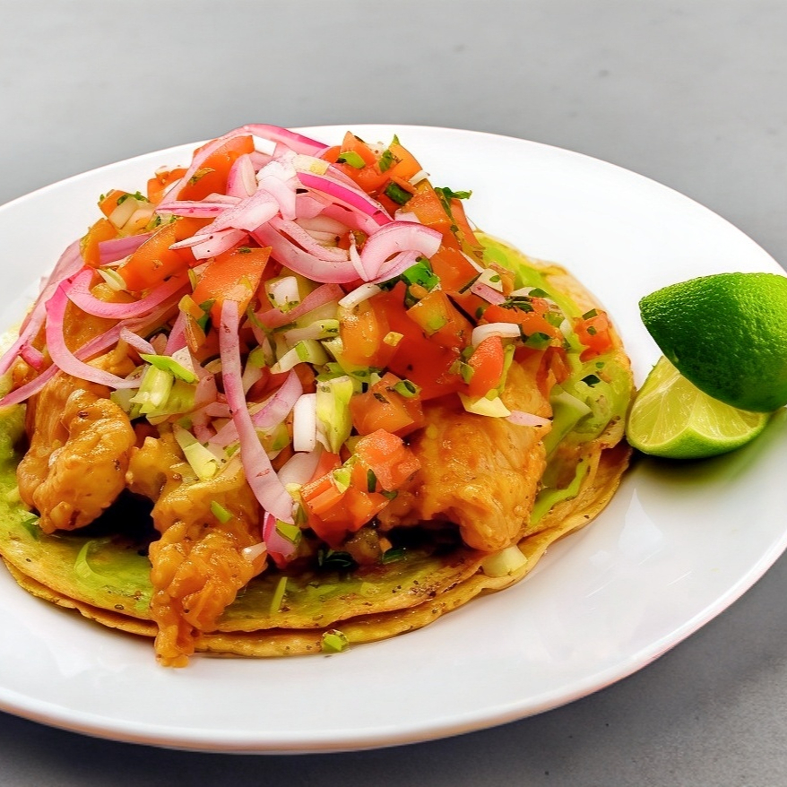 Tostada de pescado capeado con cebolla, limones y lechuga aparte.
