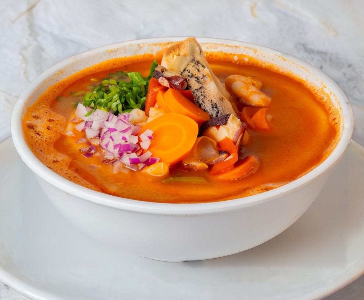 Sopa de mariscos con caldo a base de camarón, pescado y pulpo.