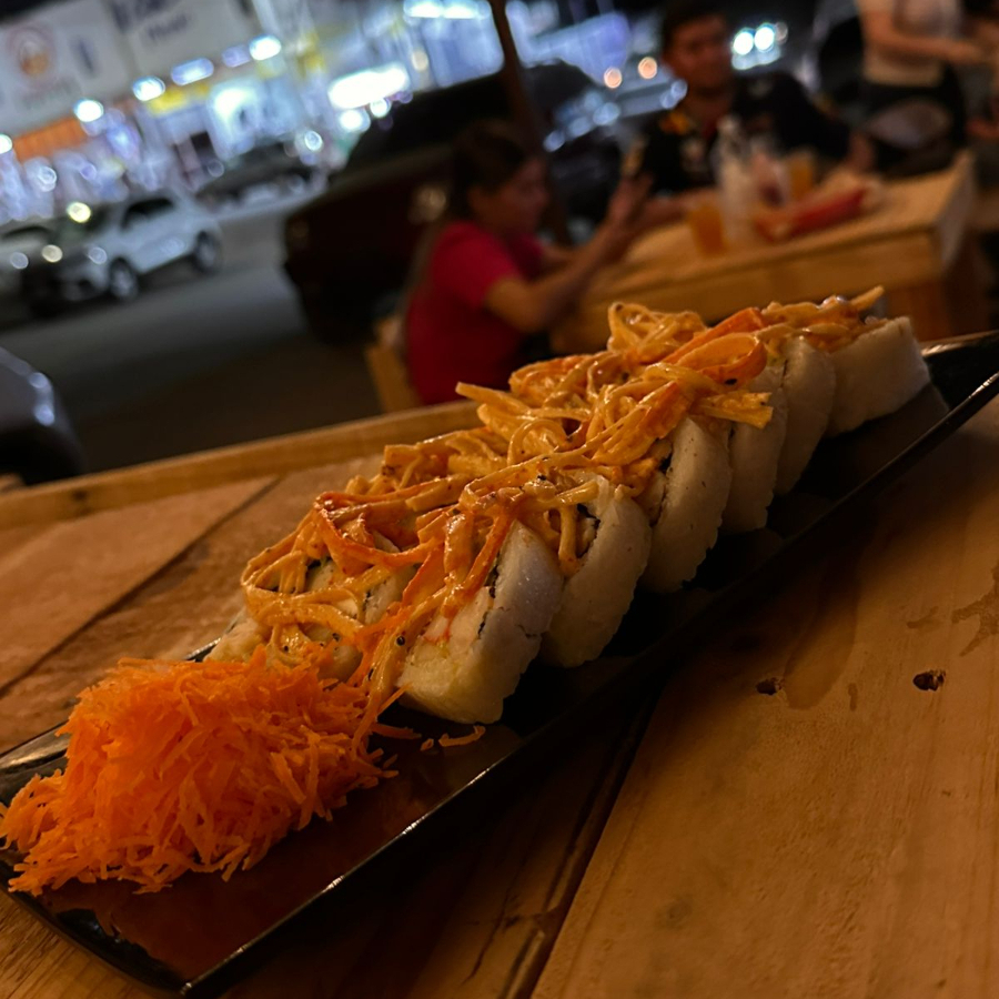 Pollo, tocino, philadelphia, pepino y aguacate por dentro, gratinado por fuera con queso chihuahua.