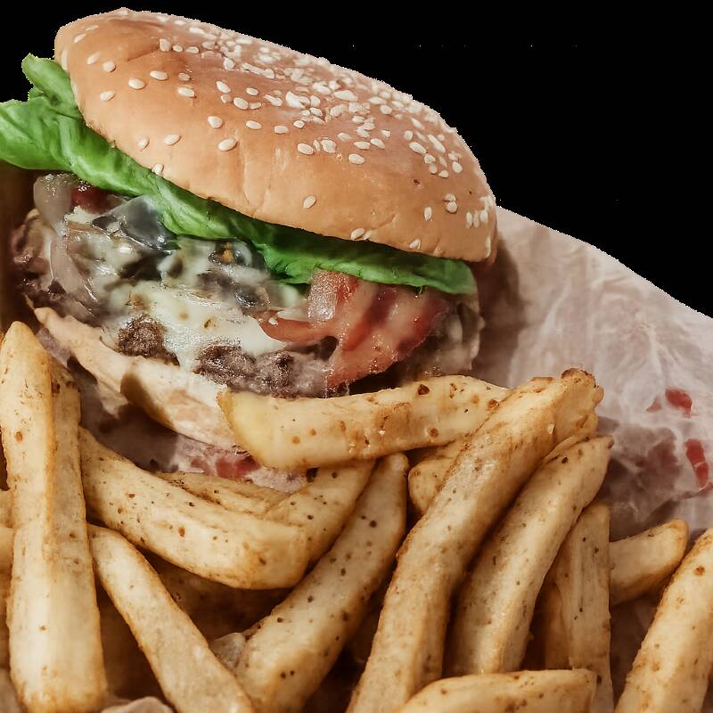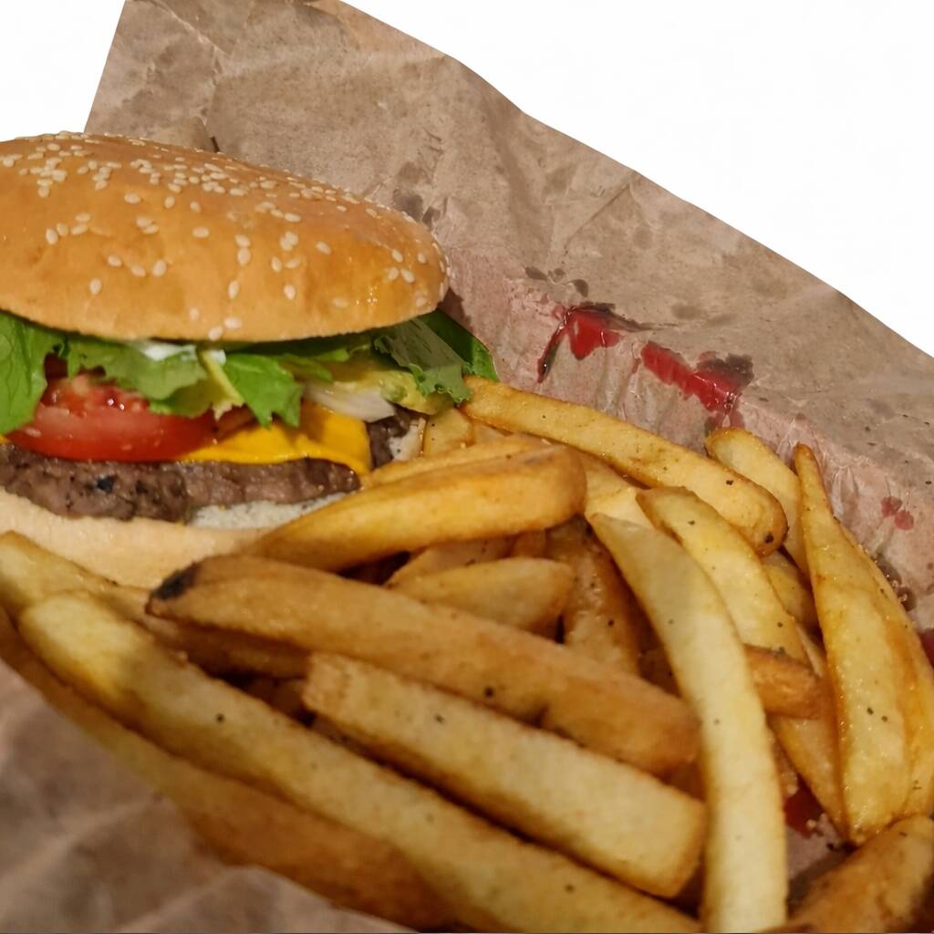 Carne preparada de la casa (150gr), queso americano, tomate, cebolla, aguacate, lechuga, papas a la francesa.
