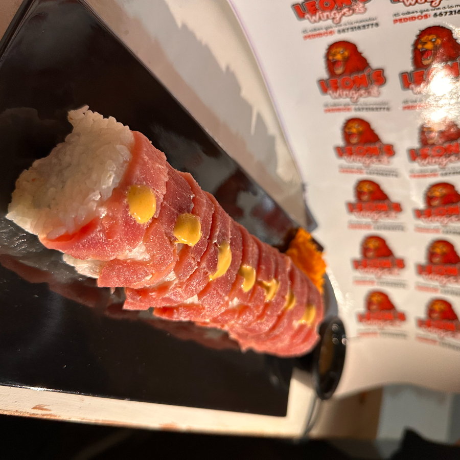 Rollo natural, Camarón empanizado, aguacate y philadelphia por dentro, por fuera forrado de atún fresco.