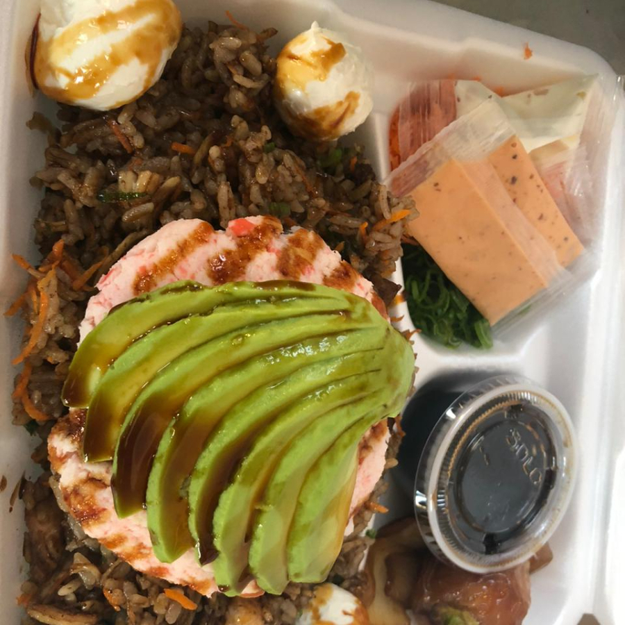 Tazón de arroz con res, pollo camarón, zanahoria y cebollin y por encima tampico, philadelphia, aguacate, anguila y furikake.