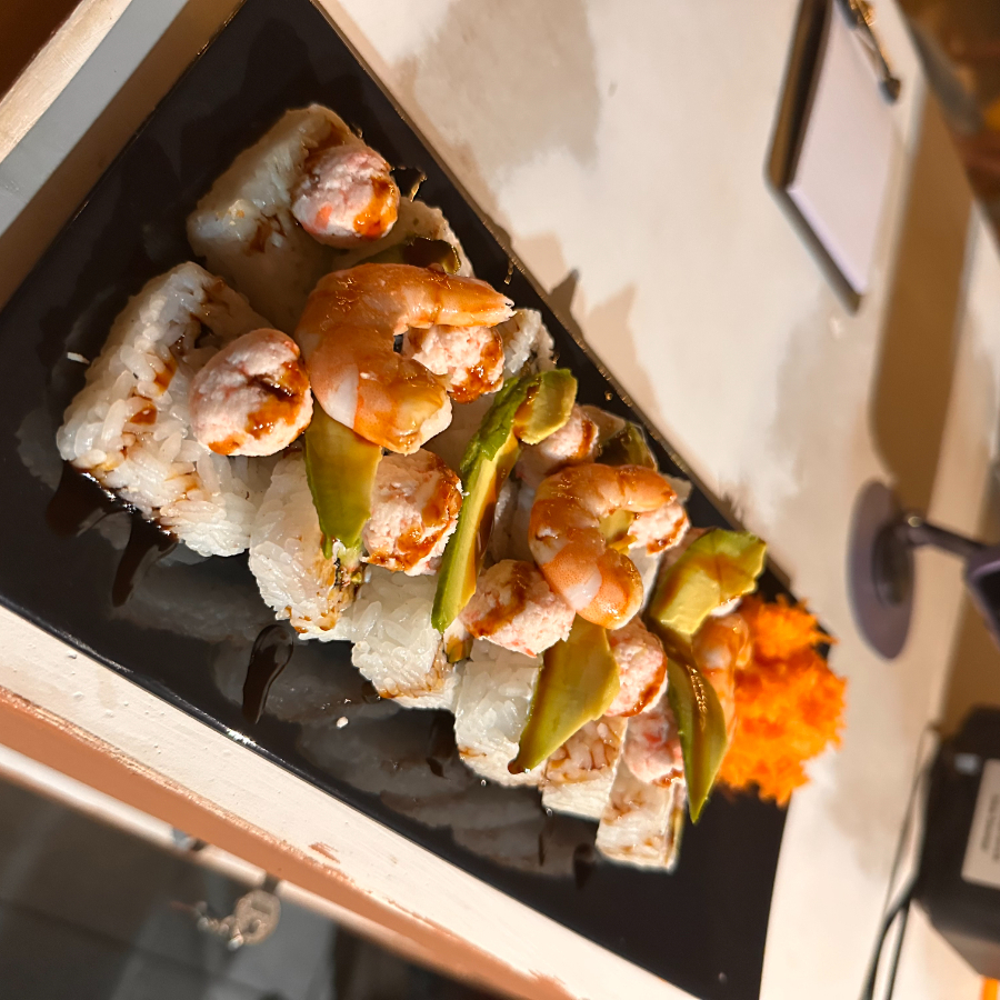 Res, philadelphia, pepino y aguacate por dentro, por fuera topping de camarón , decorado con salsa de anguila de la casa.
