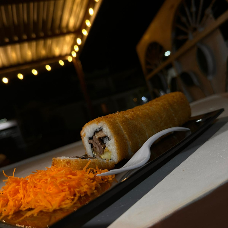 Camarón , res, philadelphia, pepino y aguacate por dentro.