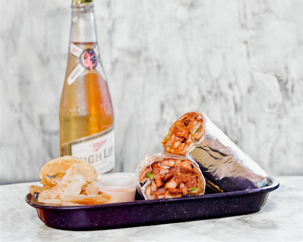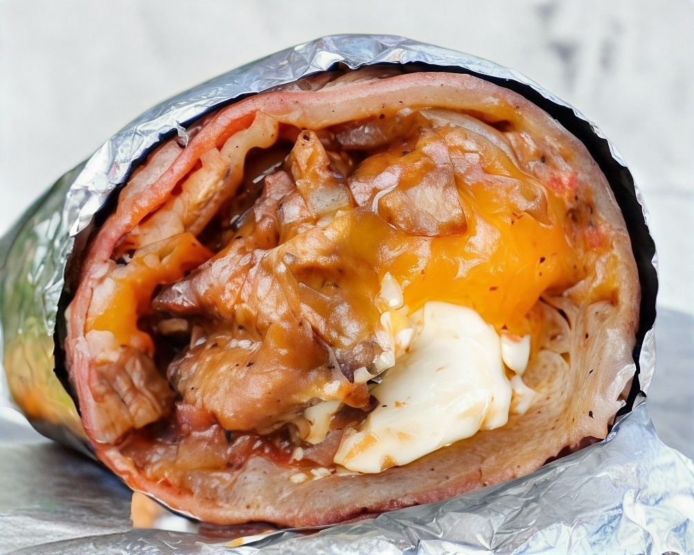Burro percheron como en sonora tortilla de harina extragrande 180gr de carne de asada de puerco salsa bbq,guisada con tomate y cebolla, una capa de queso Chihuahua y coronado de aguacate, acompañado de papas chips. peso aproximado de 450gr