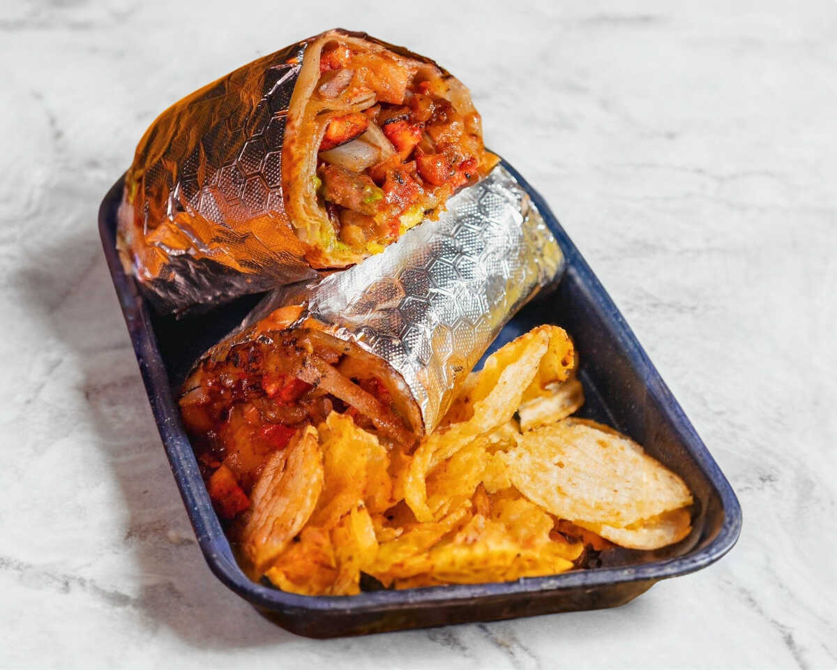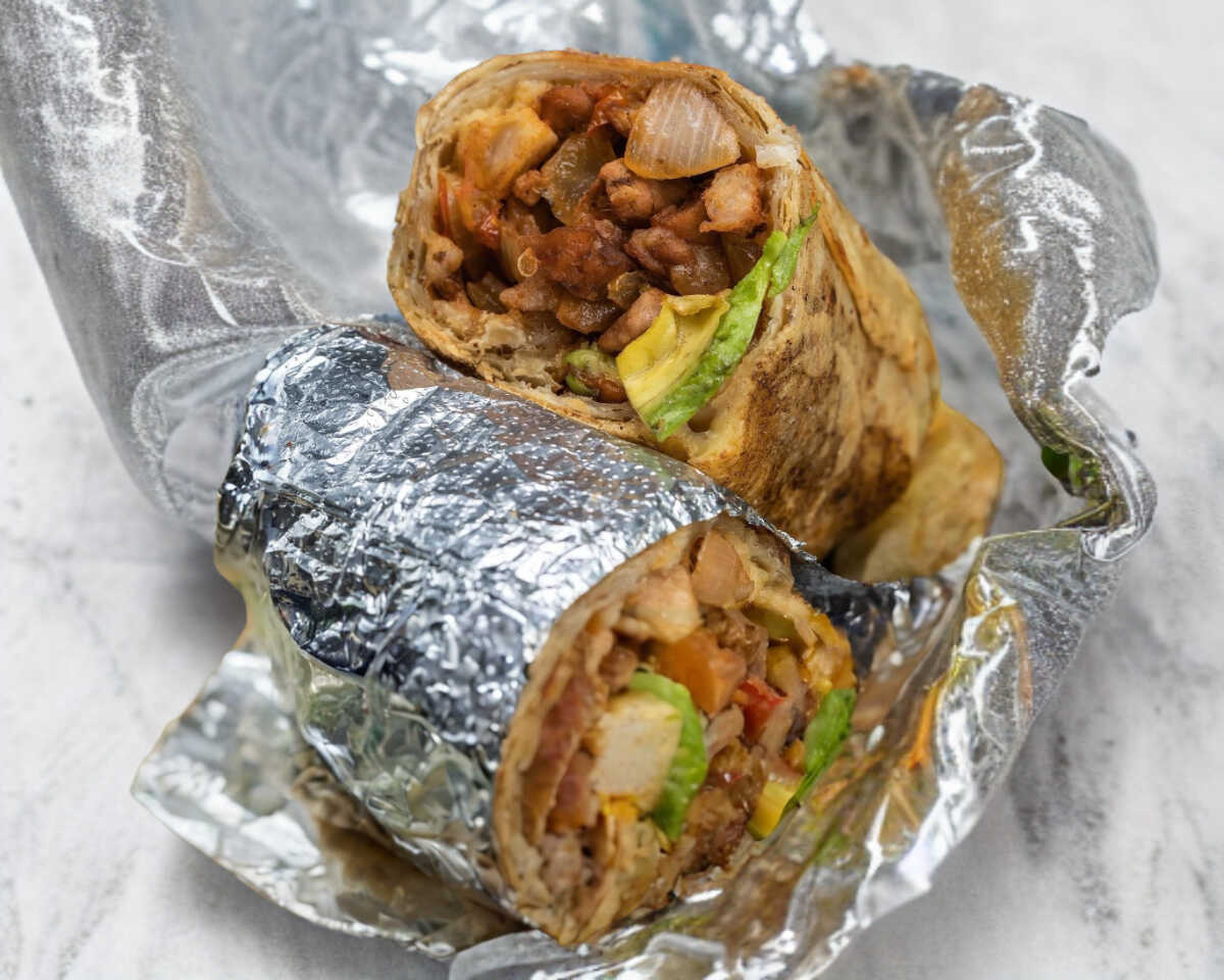 Burro percheron como en sonora tortilla de harina extragrande 180gr de carne de pastor y asada de puerco,guisada con tomate y cebolla, una capa de queso Chihuahua y coronado de aguacate, acompañado de papas chips. peso aproximado de 450gr