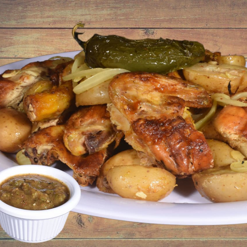 Pollo con papas grande rostizado doradito, con 10 tacos dorados, 1/2 litro de sopa fría, salsa, ensalada y tortillas.