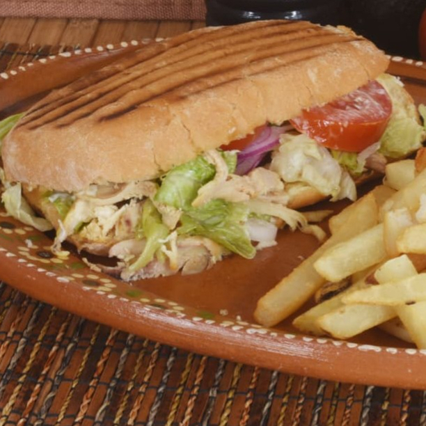 Torta de pollo rostizado con mayonesa, verdura y chile. Todo en pan enharinado, acompañado de papas a la francesa.