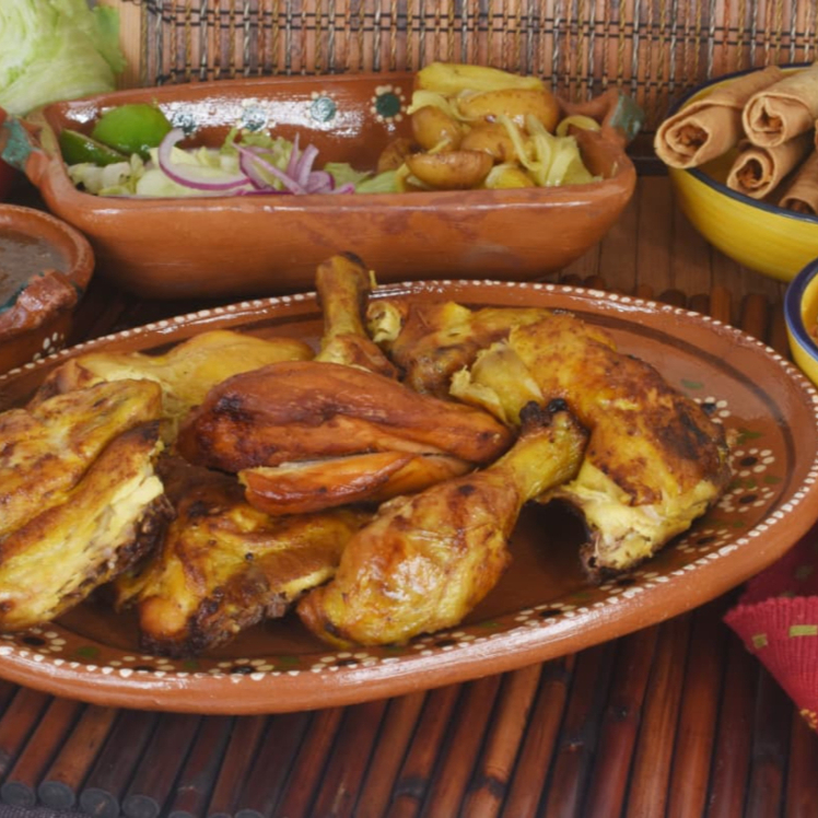 Pollo grande con papas cambray, cebolla, chile, salsa, ensalada y tortillas