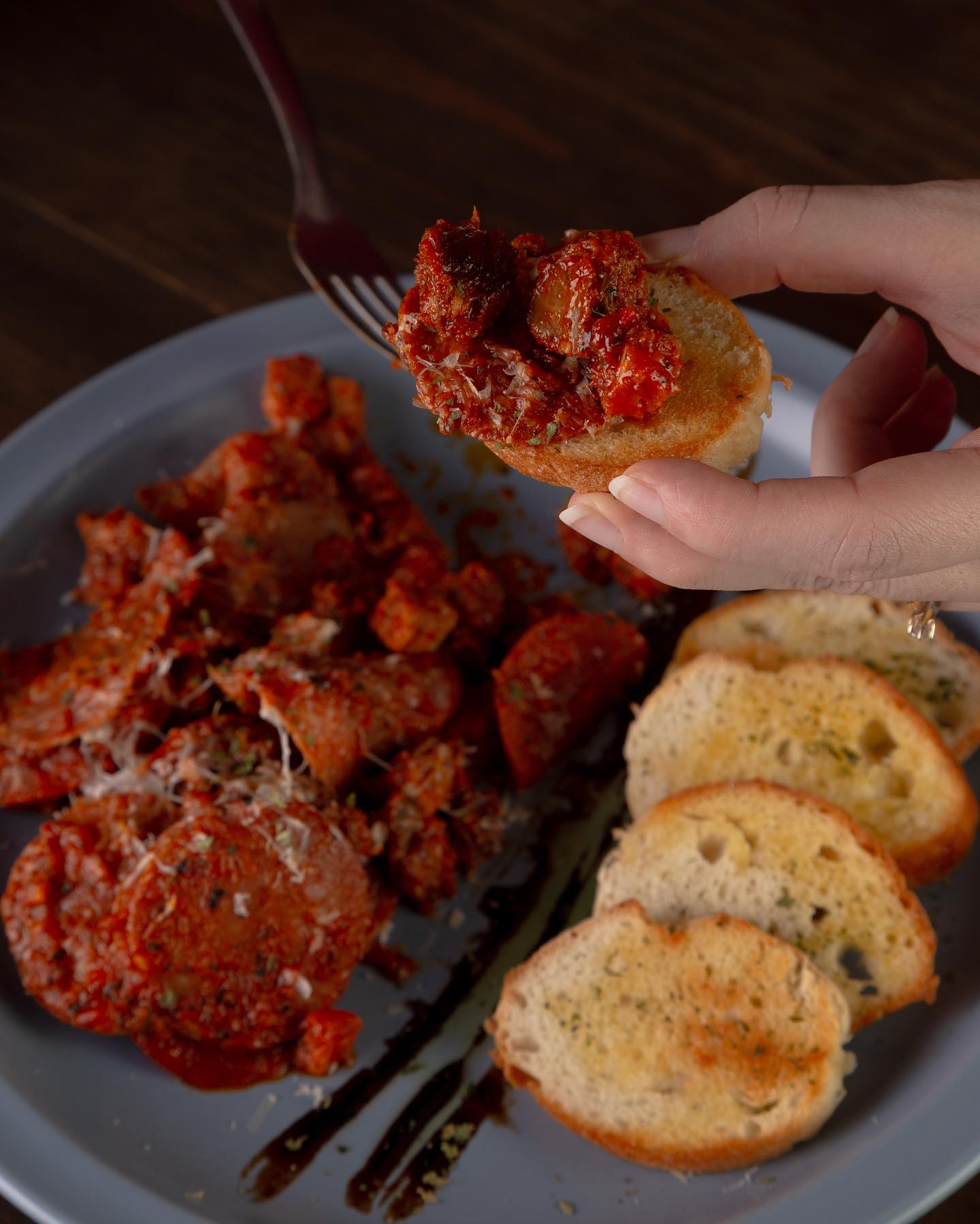 Salteado de tocino, salchicha italiana, pepperoni y salami en salsa de tomate y ajo, acompañado de pan de la casa.