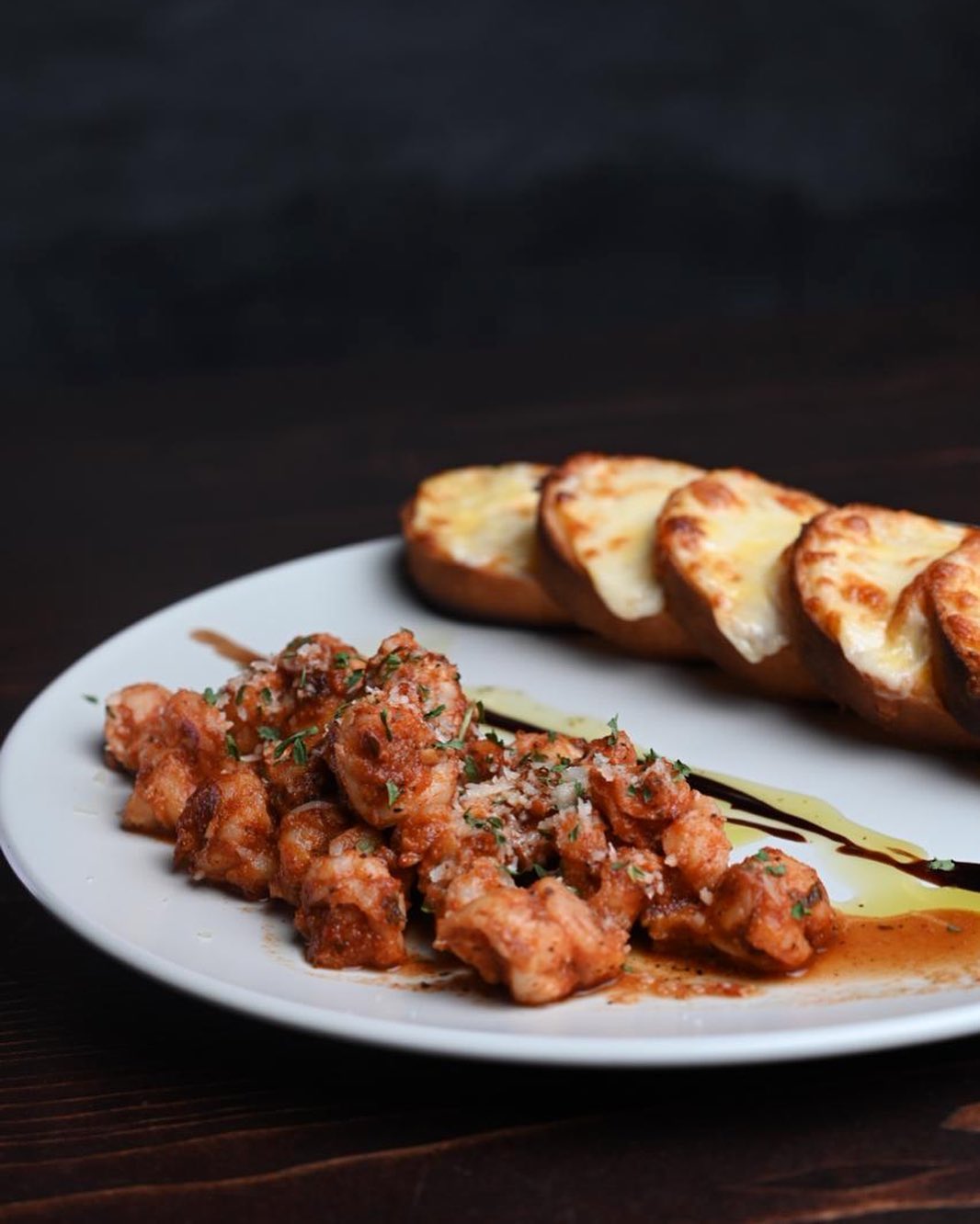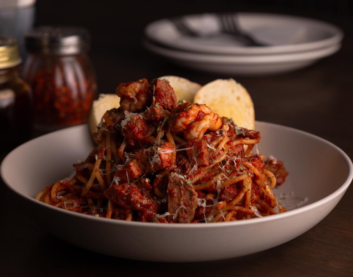 Camarón salteado con tocino, mantequilla, chile de árbol y balsámico, con salsa de tomate y salchicha italiana.