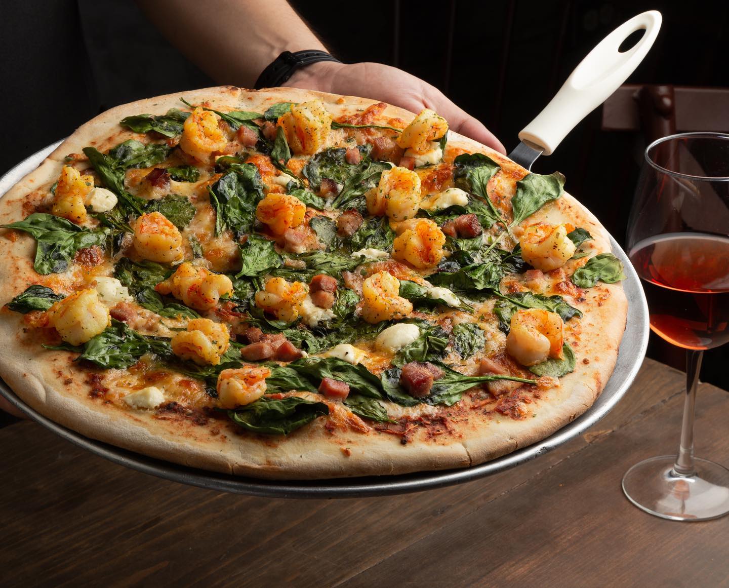 Camarón salteado con mantequilla y limón, tocino, queso de cabra y espinaca.
