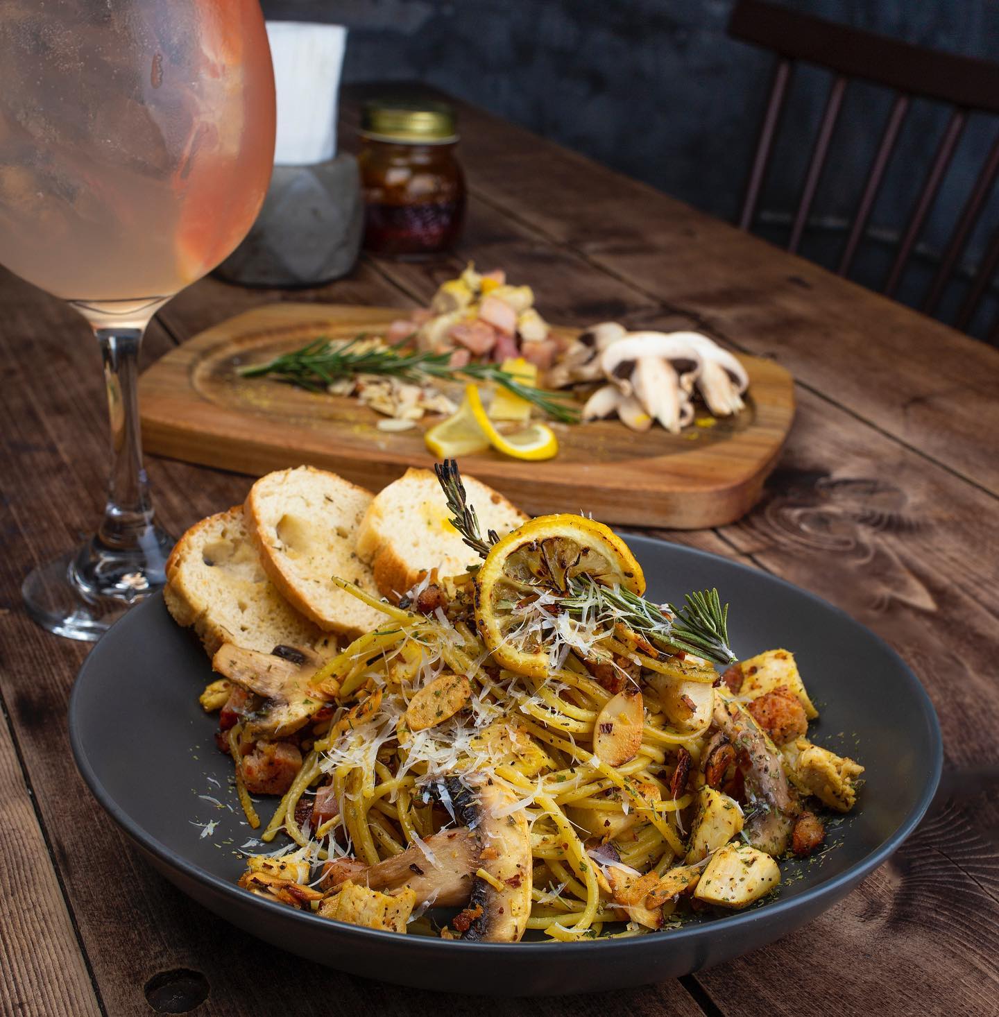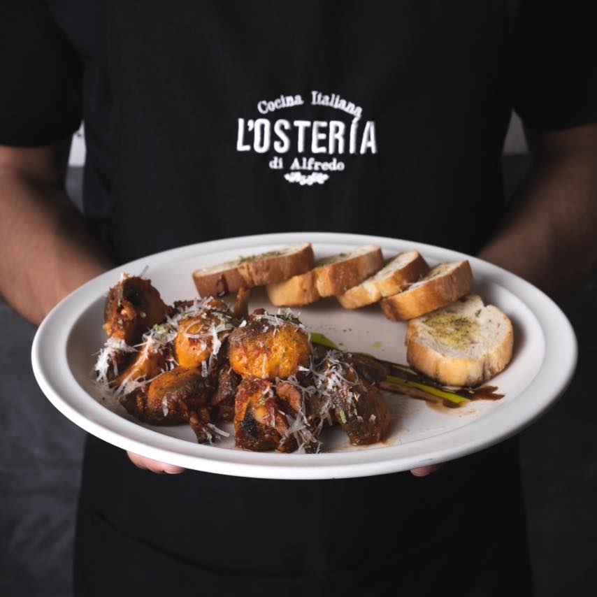 Champiñones salteados con ajo, chile de árbol y salsa de tomate, servido con parmesano, acompañado de pan de la casa.