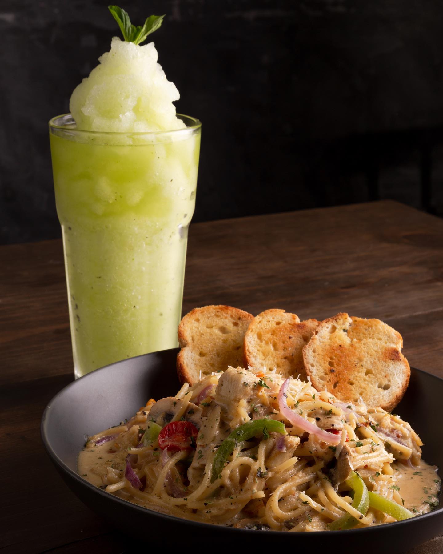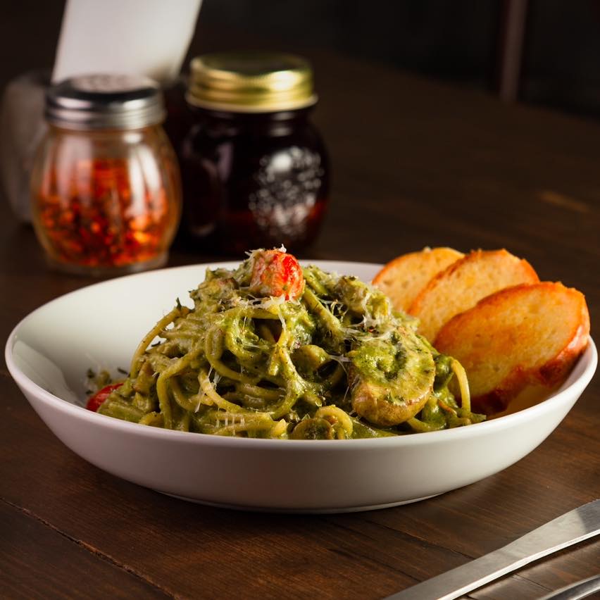 Pollo, champiñones y tomate cherry, salteados en salsa pesto y parmesano.