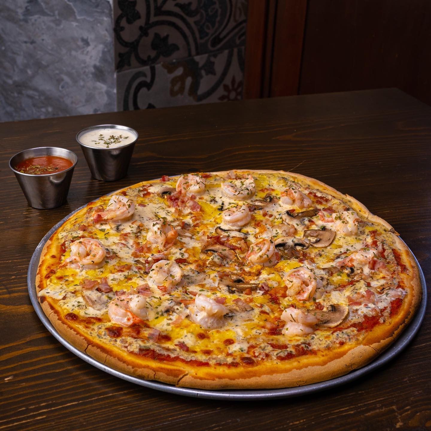 Tocino, champiñones, camarón, bañada en salsa Alfredo.