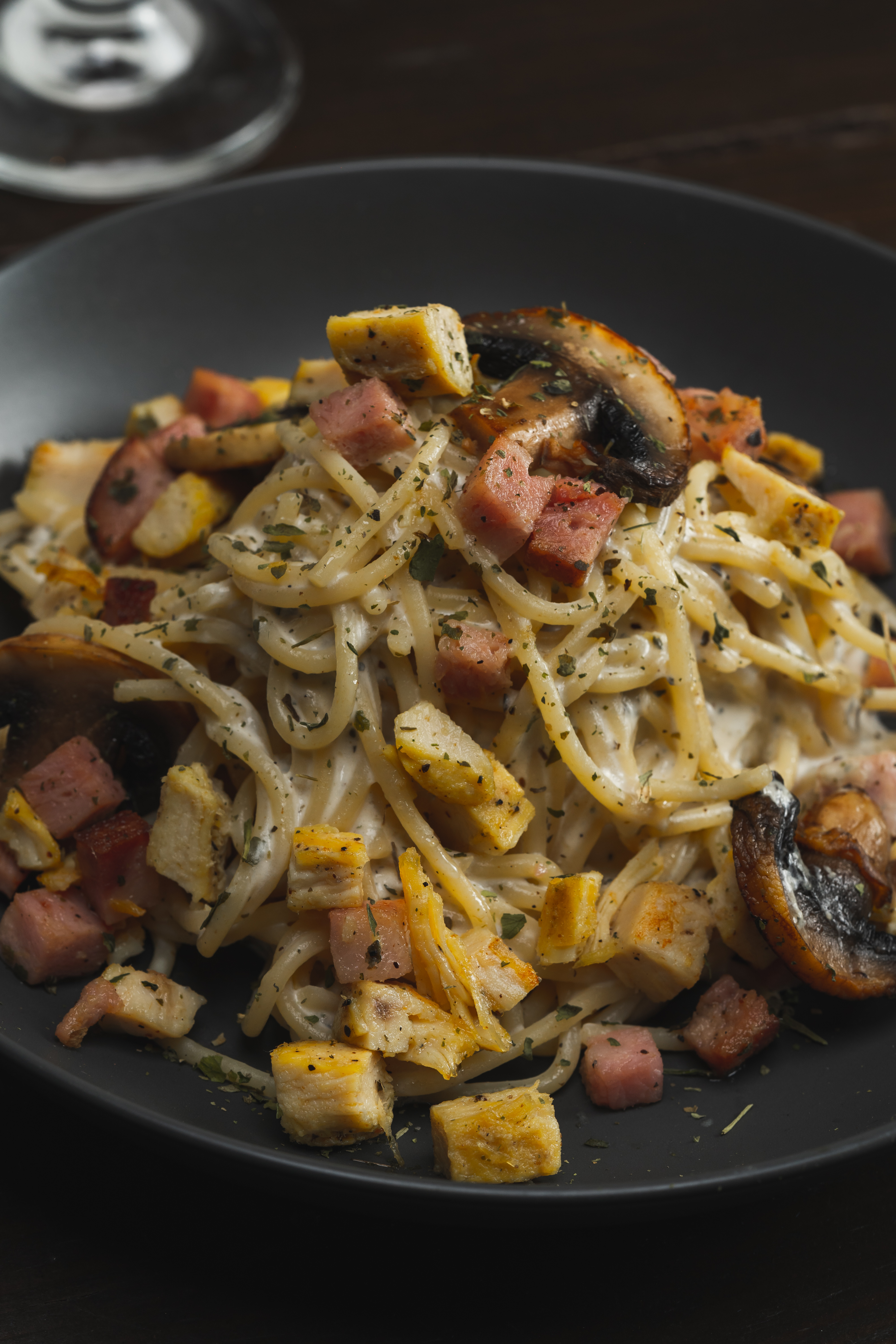 Tocino, champiñones, pollo, bañada en salsa Alfredo.