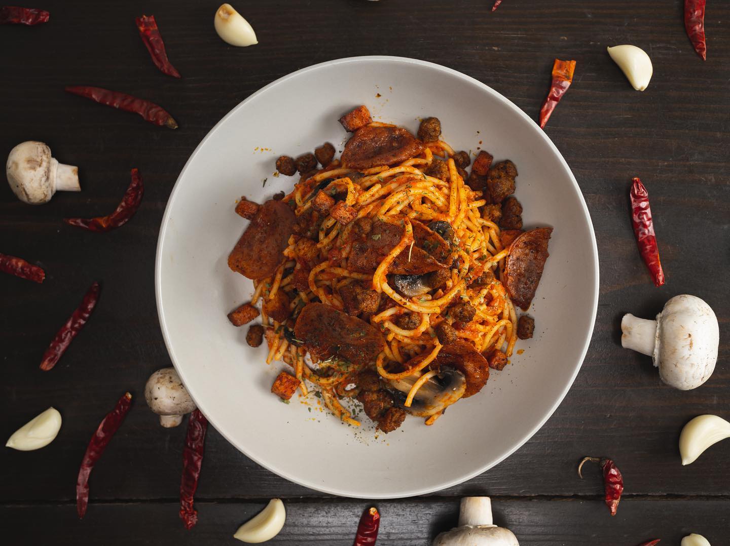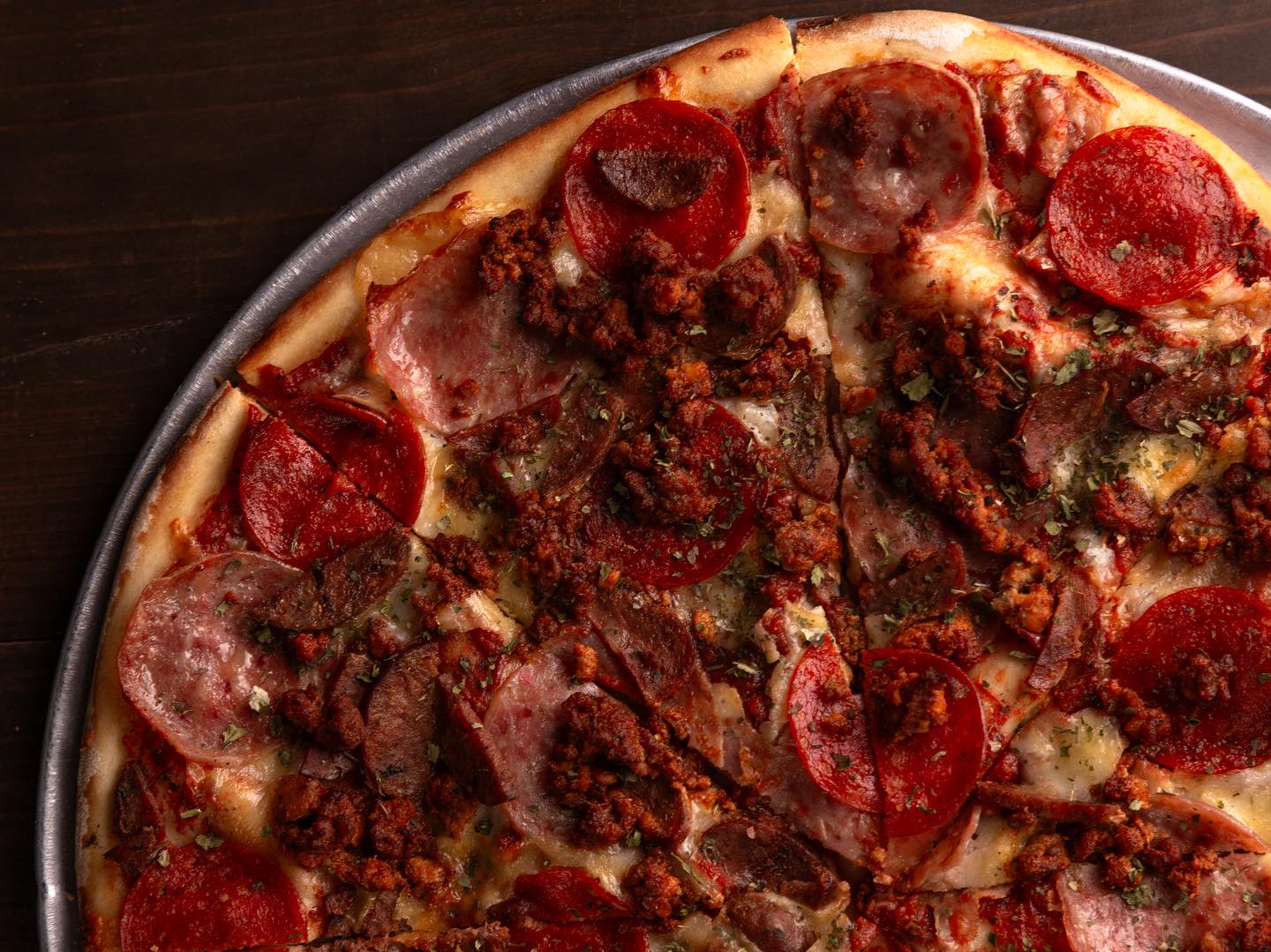 Salchicha italiana, salami, tocino, champiñón salteado con chile de árbol y salsa de tomate.