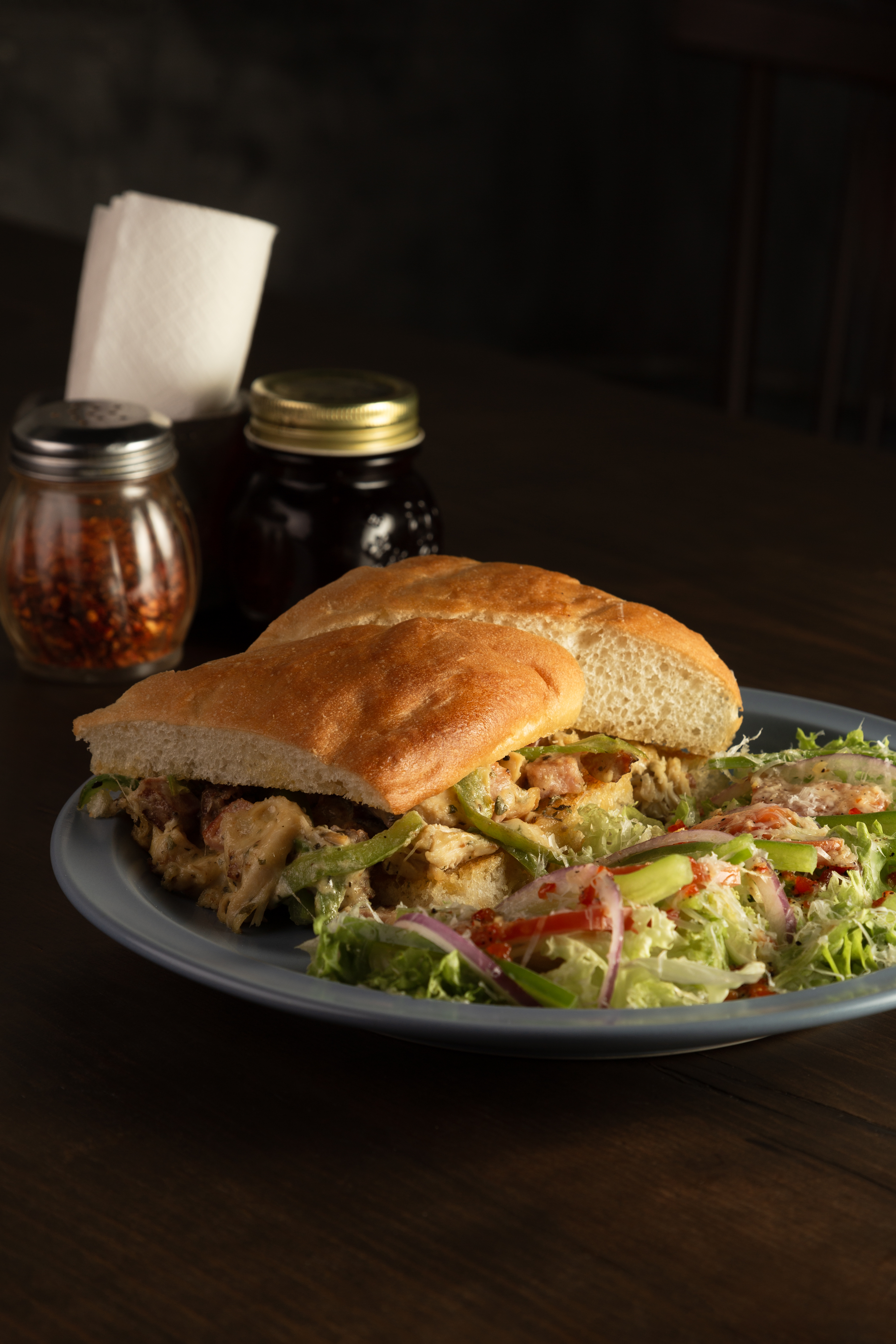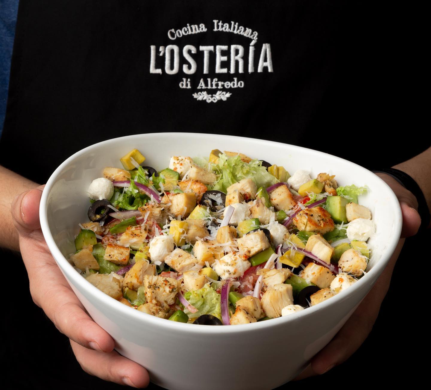 Pollo a la plancha, lechuga, tomate, cebolla, aceitunas, aguacate, queso de cabra y parmesano con vinagreta de la casa.