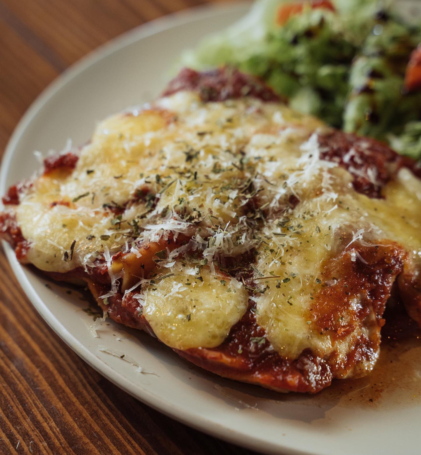 Tradicional lasagna de carne molida, champiñones, mozzarella y parmesano.