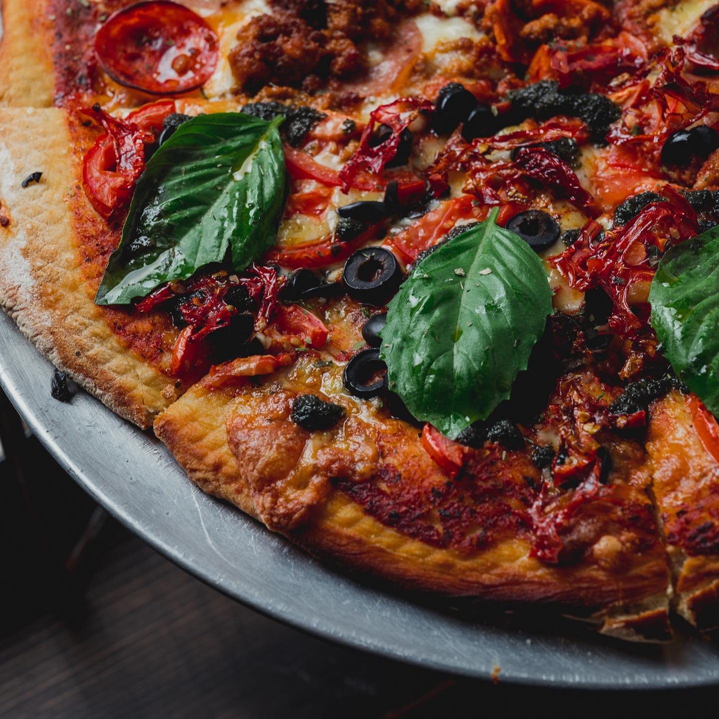 Tomate deshidratado casero, tomate fresco, aceituna, albahaca y pesto