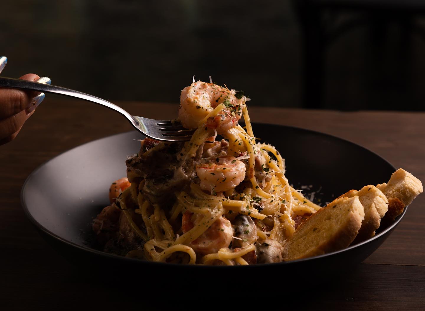 Salsa Alfredo, tocino, champiñones y camarón.