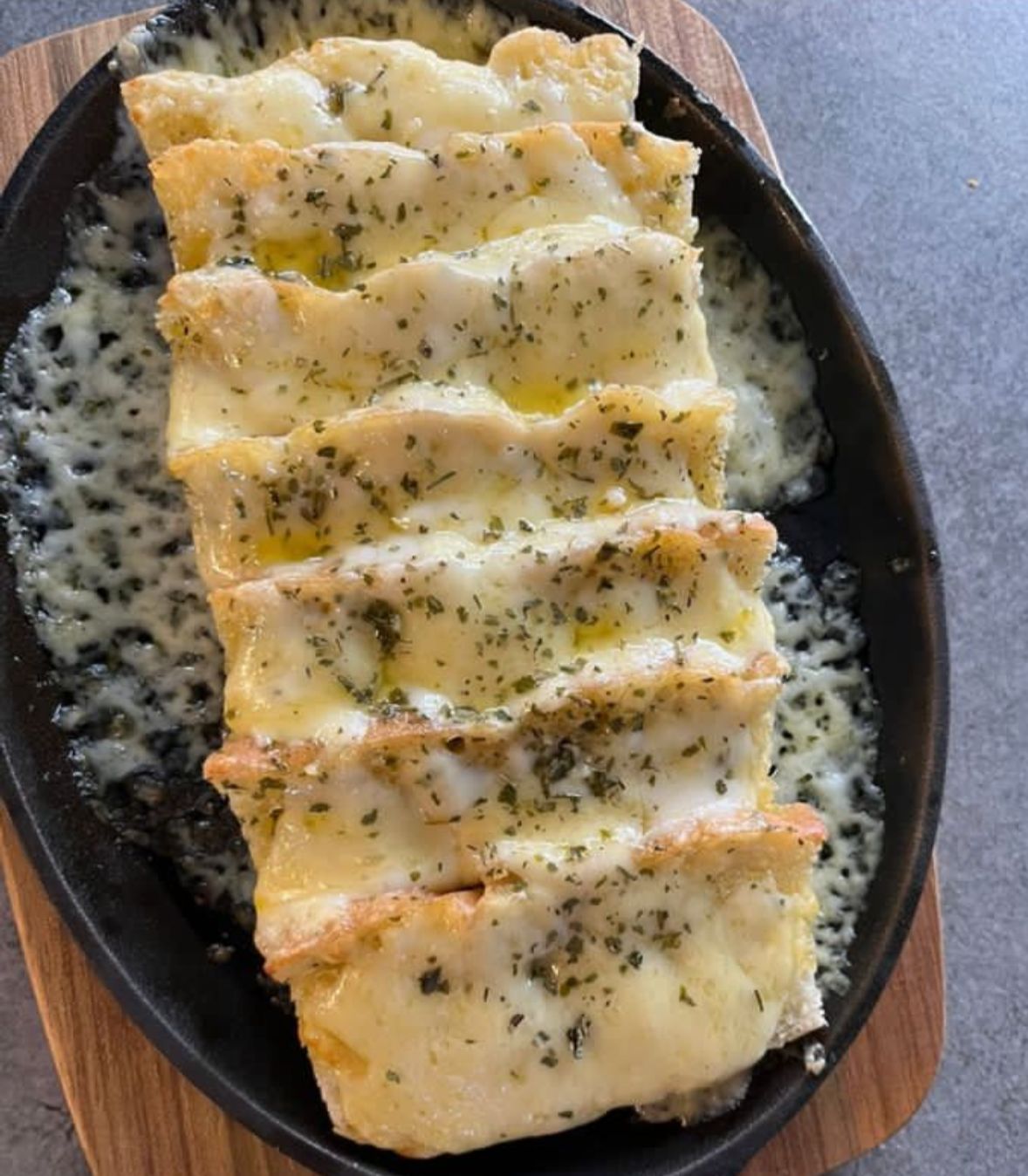 Pan focaccia artesanal, horneado con queso, mantequilla al ajo y parmesano, acompañado de salsa de tomate.
