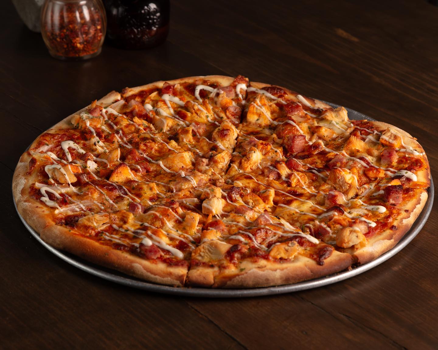 Tocino, cebolla y pollo en salsa búfalo, rayada con aderezo ranch.
