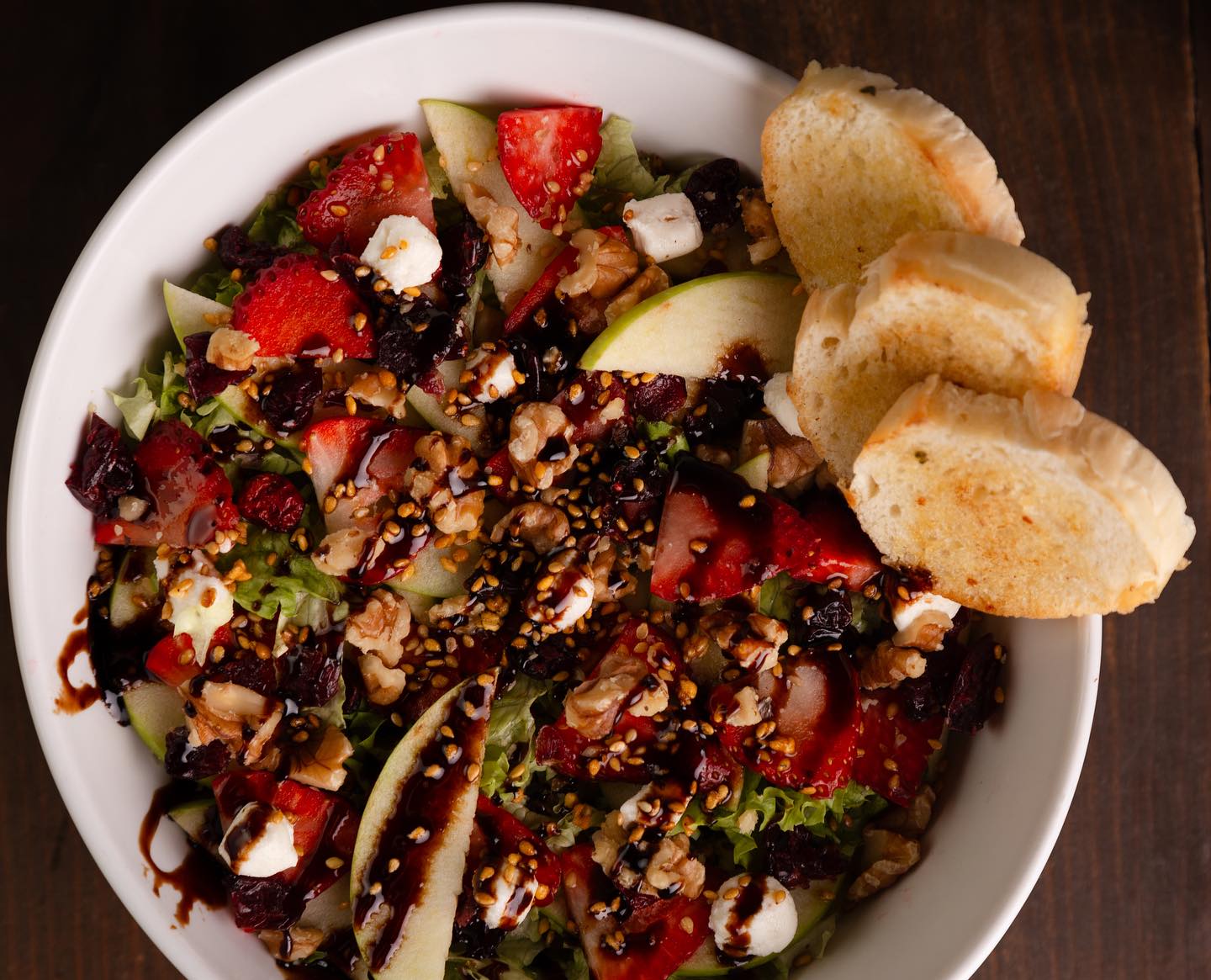Lechuga, manzana verde, fresa, arándano, nuez y queso de cabra bañada con reducción de balsámico con fresa y ajonjolí garapiñado.