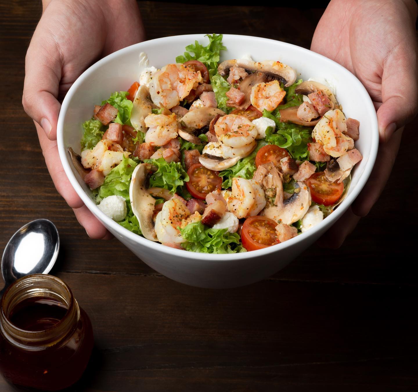 Lechuga, almendras tostadas, champiñón, tomate cherry, tocino, camarón, queso de cabra y vinagreta limón.