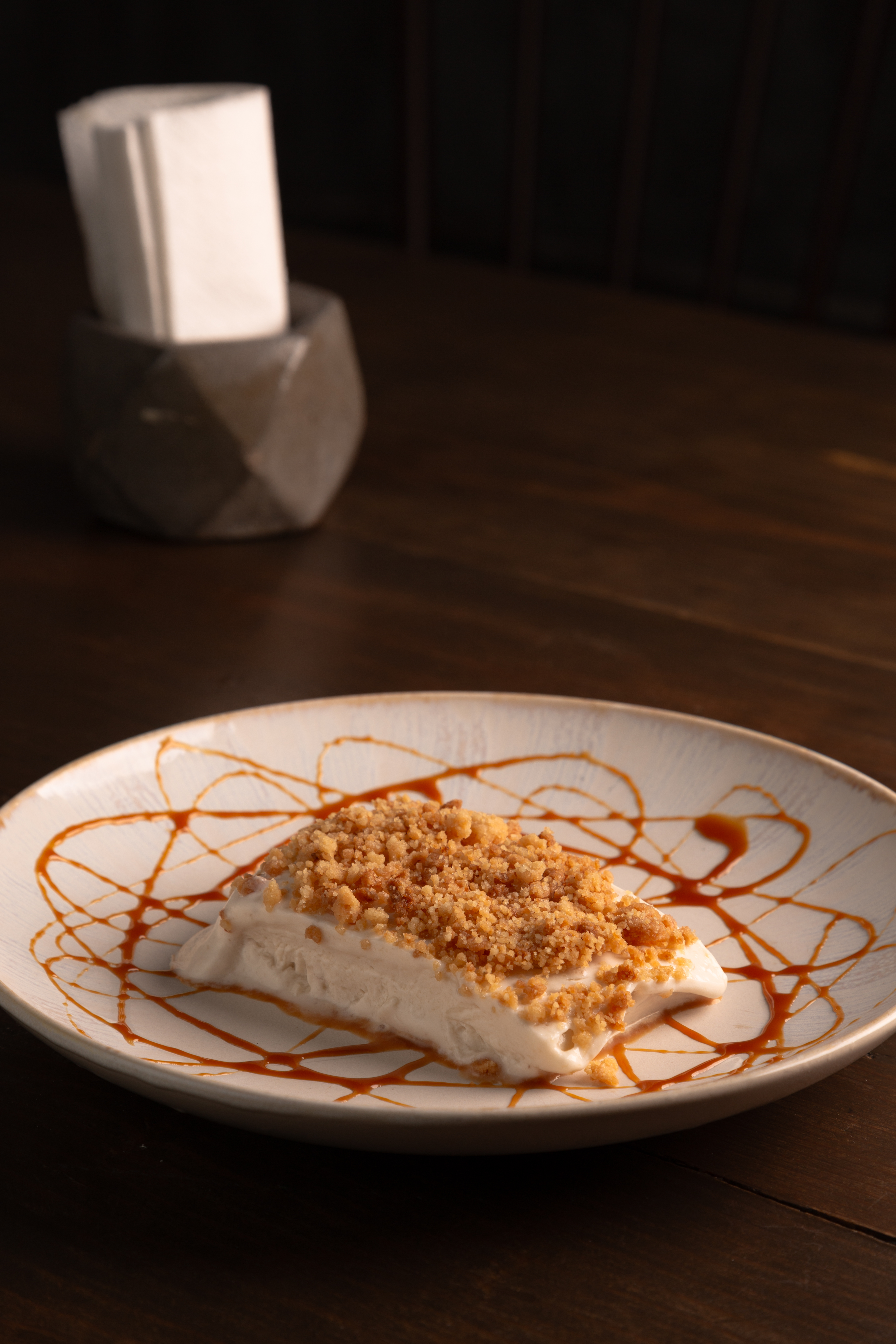 Crepa rellena de cajeta flameada en licor de dulce y caramelo, encima nieve de vainilla, manzana caramelizada, nuez y ajonjolí garapiñado.
