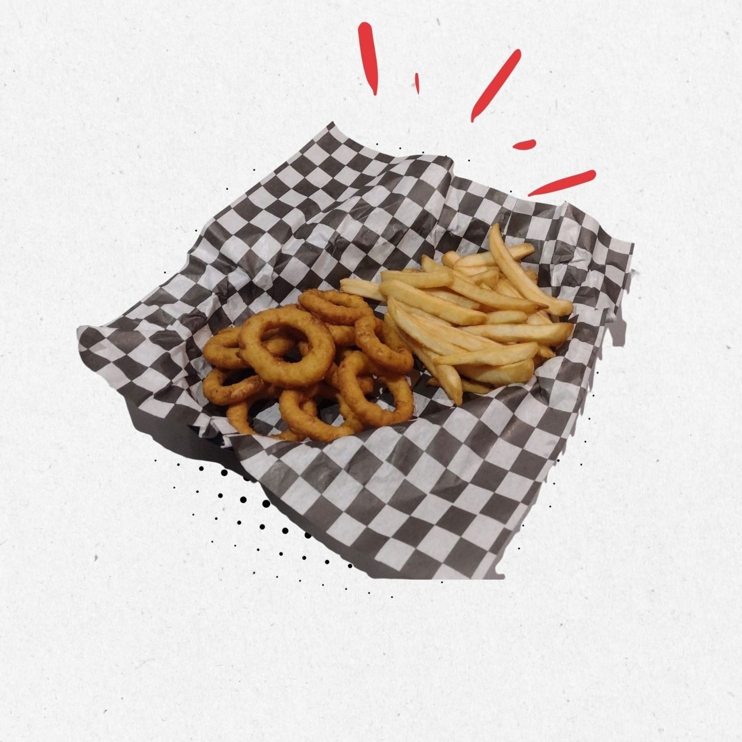 Hot dog con salchicha envueta en tocino, con tomate fresco, cebolla blanca, acompañado de papas ala francesa, y media orden de boneless con la salsa de su eleccion.(Capsup, Mostaza, Chiles, Champiñones Incluidos.)