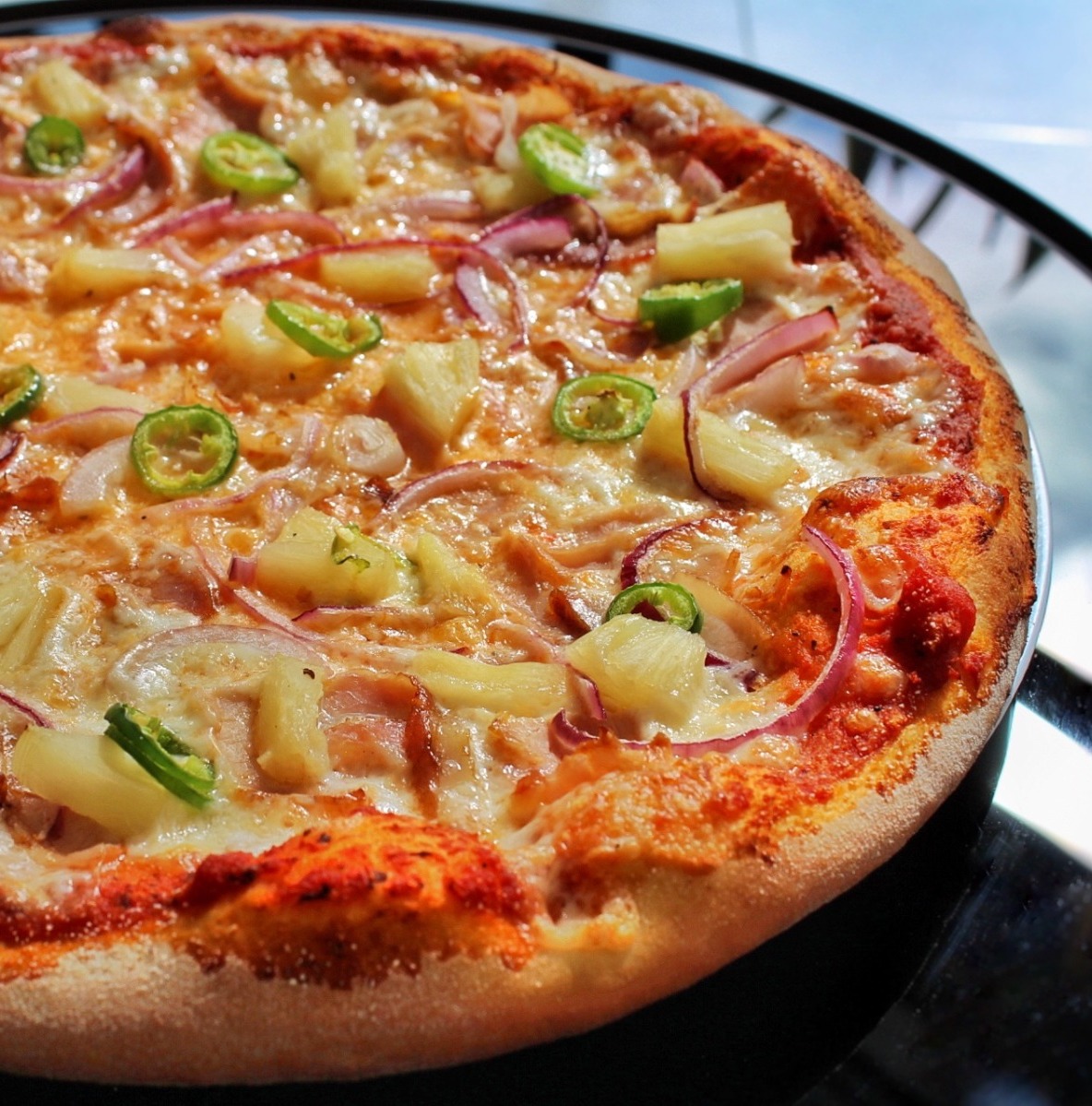 Mozzarella, lomo de cerdo, tocino, piña, cebolla morada y jalapeño.