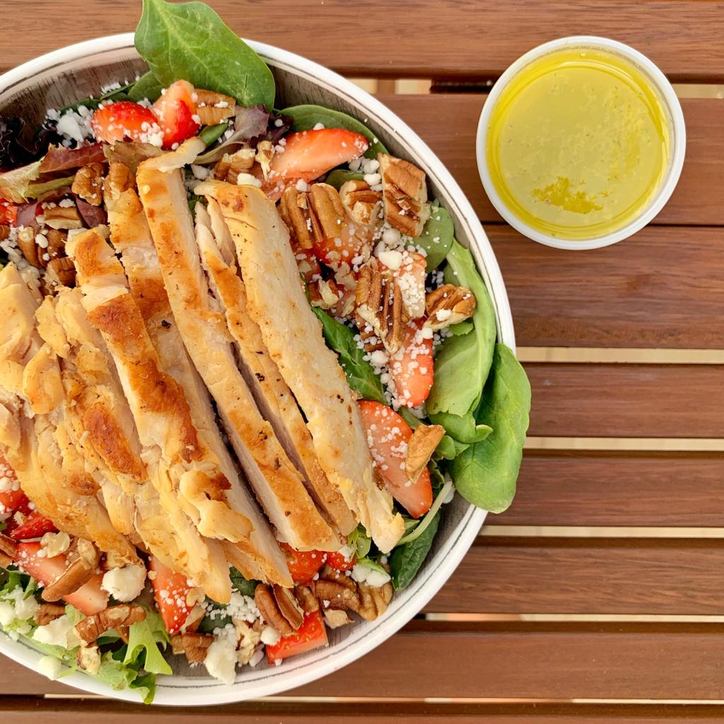 Mix de lechugas y espinaca, fruta de temporada, queso feta, nuez, pechuga de pollo asada y vinagreta cítrica hecha en casa.