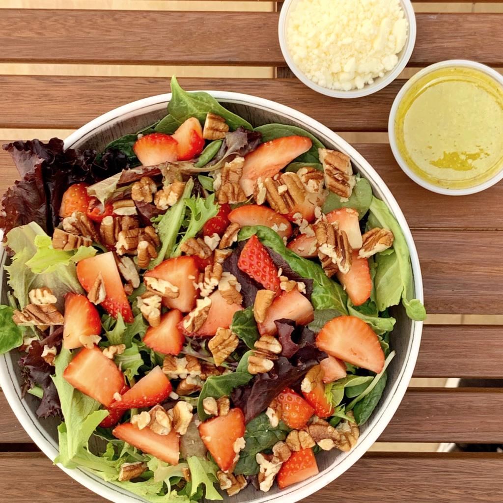 Mix de lechugas y espinaca, fruta de temporada, queso feta, nuez y vinagreta cítrica hecha en casa.