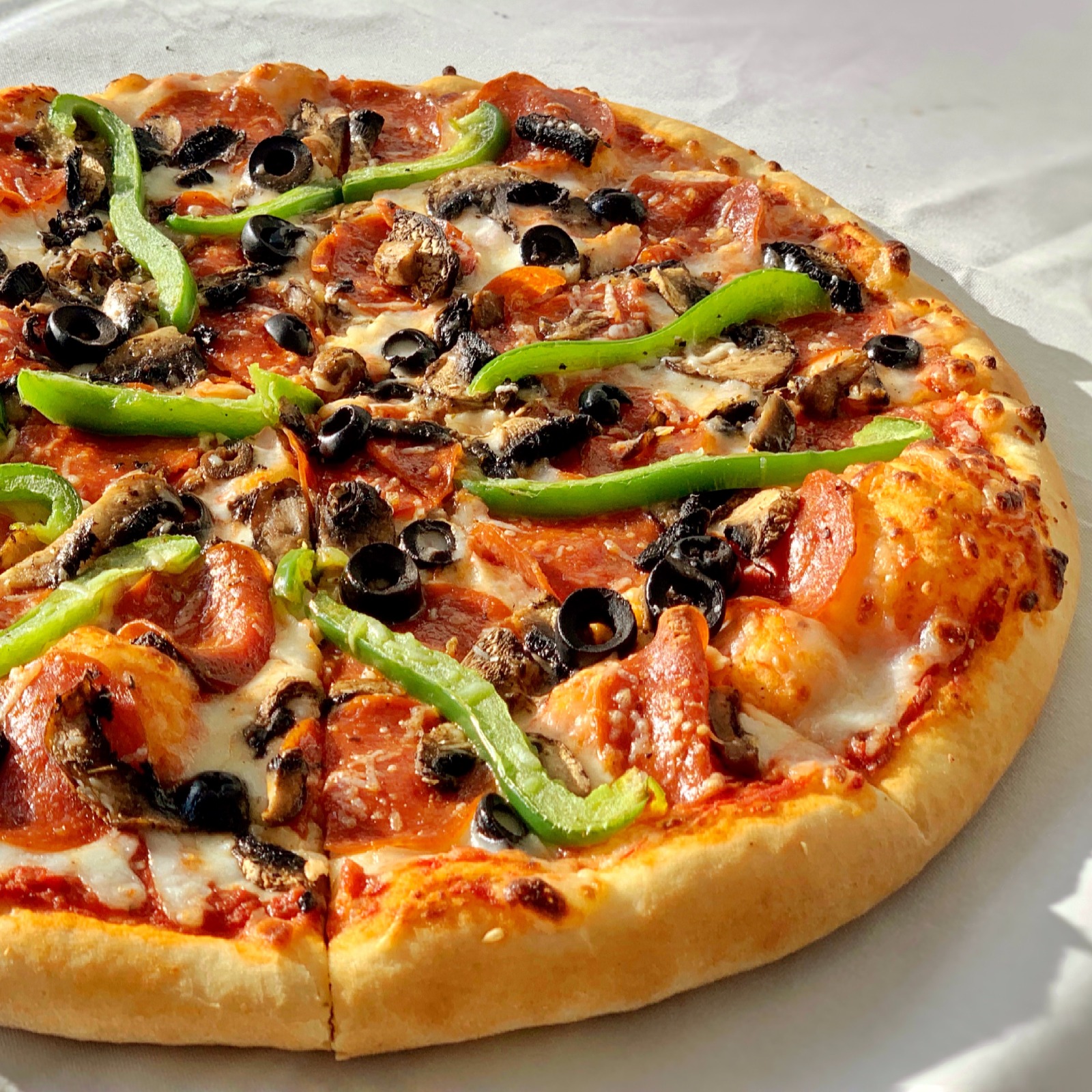 Mozzarella, pepperoni, champiñón, morrón verde, aceituna negra y parmesano.