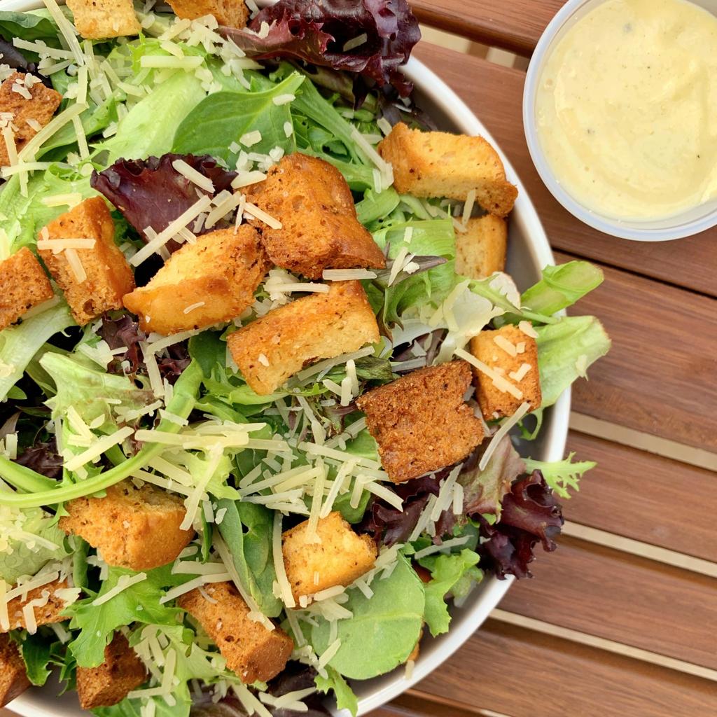 Mix de lechugas y espinaca, crotones de pan integral, parmesano y aderezo César hecho en casa.
