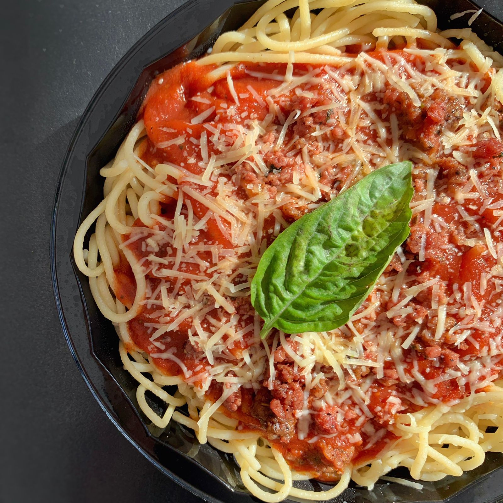 En salsa bolognesa, mozzarella, parmesano y una mezcla de ricota con albahaca.