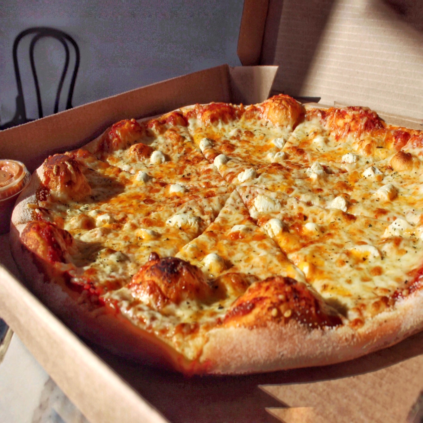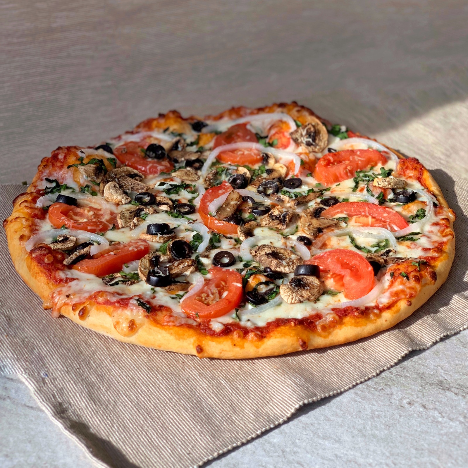 Mozzarella, queso de cabra, espinaca, champiñón, tomate, cebolla, aceituna negra, albahaca y parmesano.