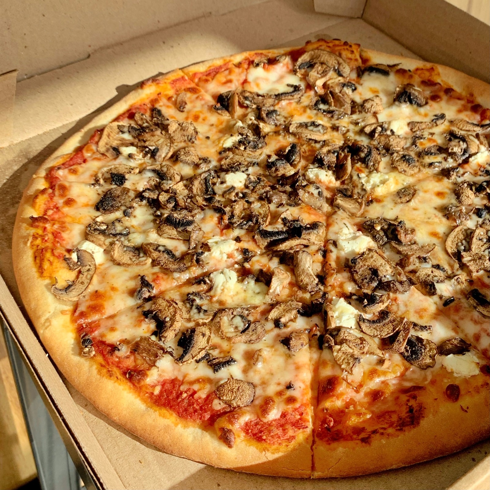 Mozzarella, mix de champiñones salteados, queso de cabra y parmesano.