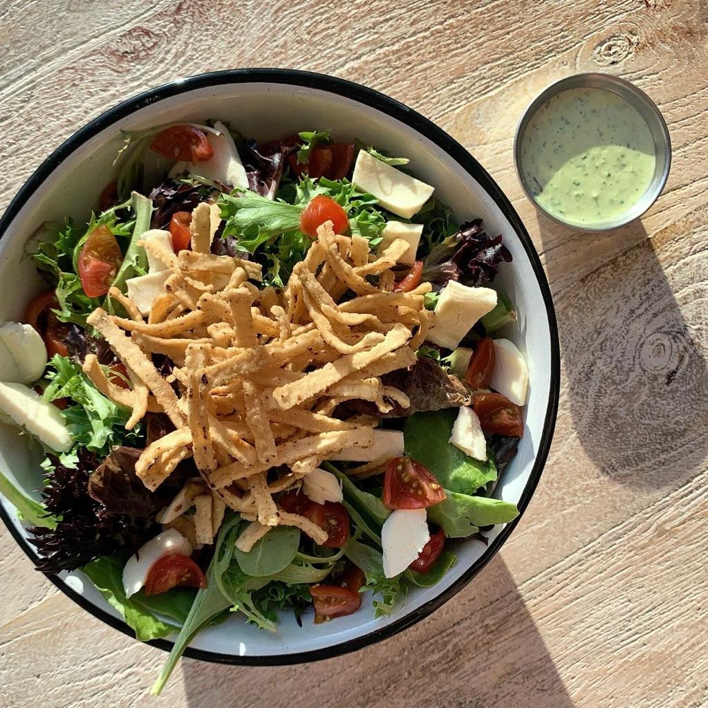 Mix de lechugas y espinaca, tomate cherry, mozzarella fresco, frituras de maíz y aderezo de cilantro hecho en casa.