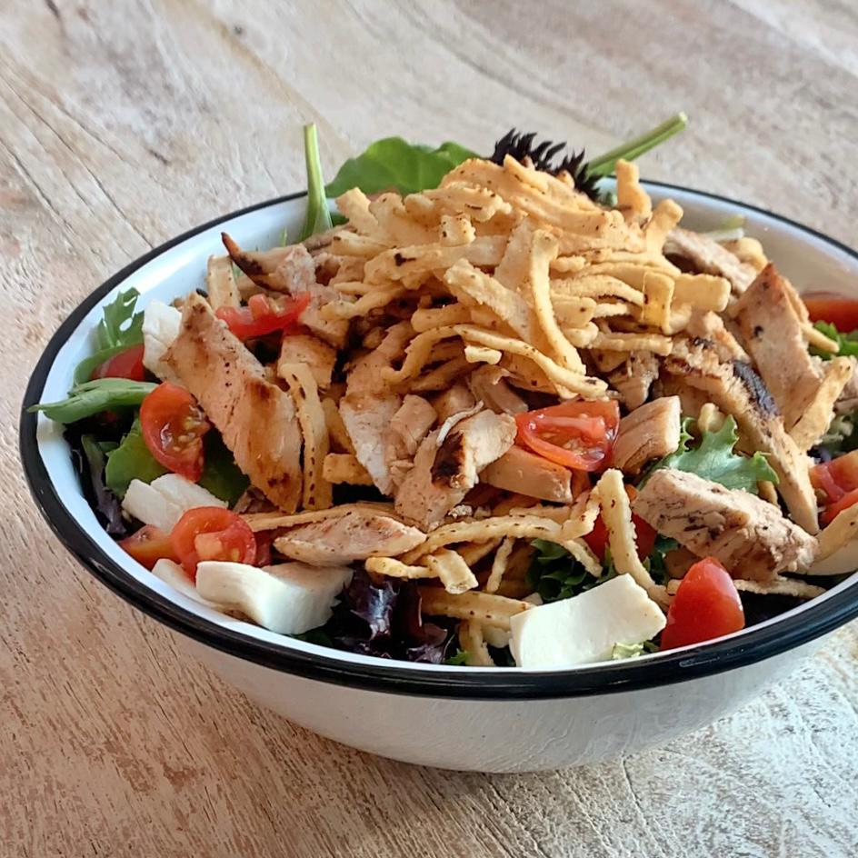 Mix de lechugas y espinaca, tomate cherry, mozzarella fresco, frituras de maíz, pechuga de pollo asada y aderezo de cilantro hecho en casa.