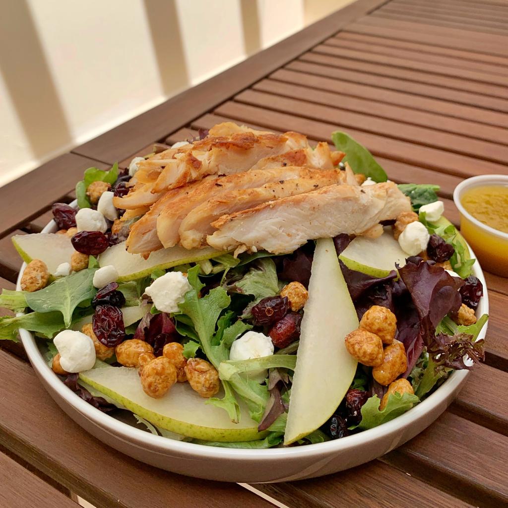 Mix de lechugas y espinaca, queso de cabra, pera, arándanos, cacahuate garapiñado, pechuga de pollo asada y aderezo de maple hecho en casa.