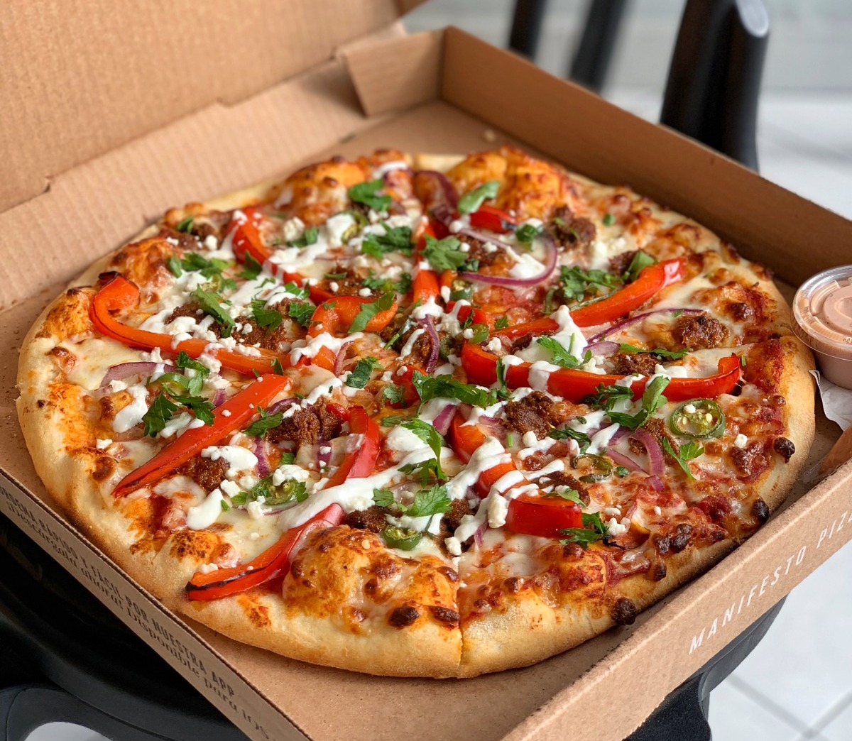 Mozzarella, chilorio, cebolla morada, morrón rojo, chile serrano, crema y queso fresco.