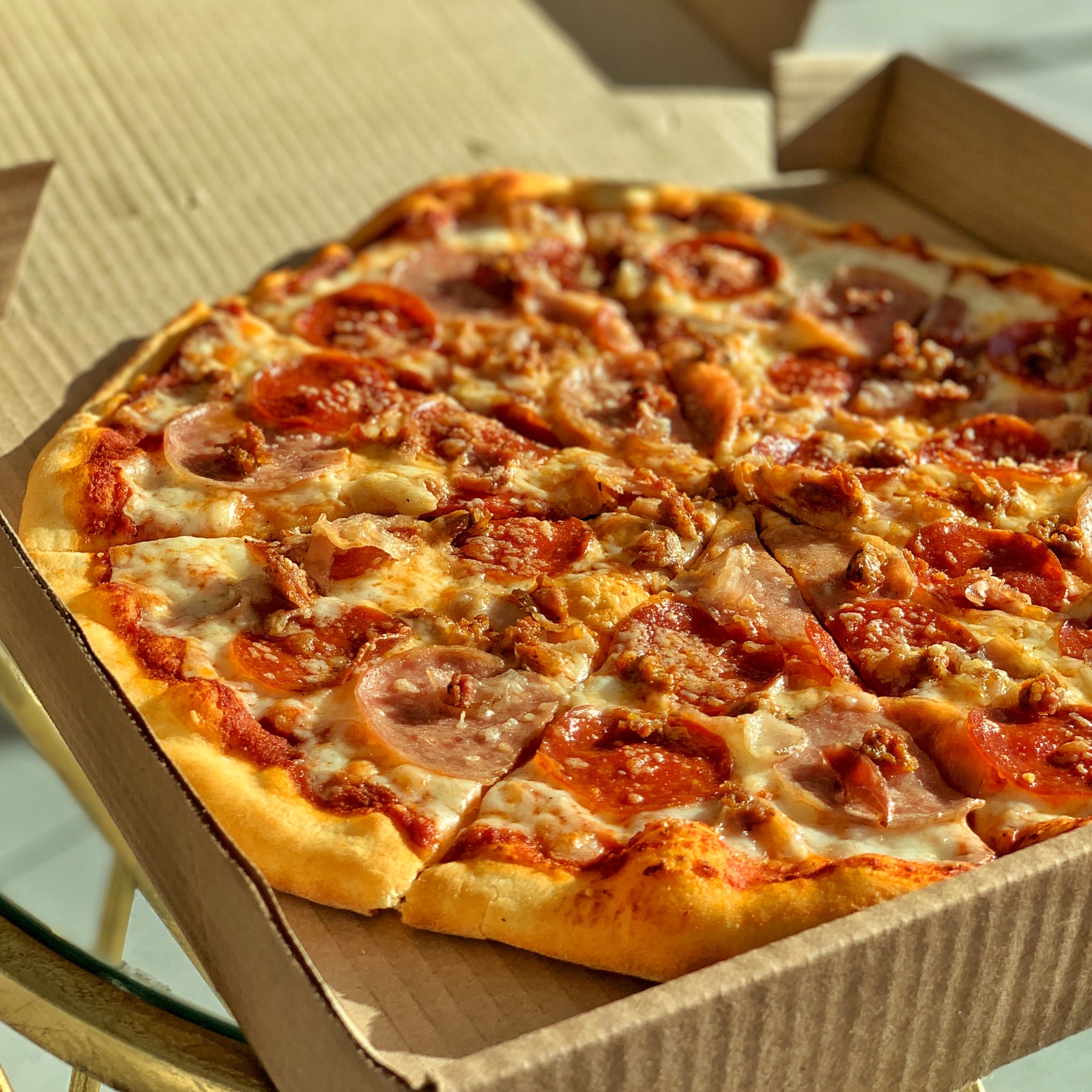 Mozzarella, salami, pepperoni, salchicha italiana, tocino y parmesano.
