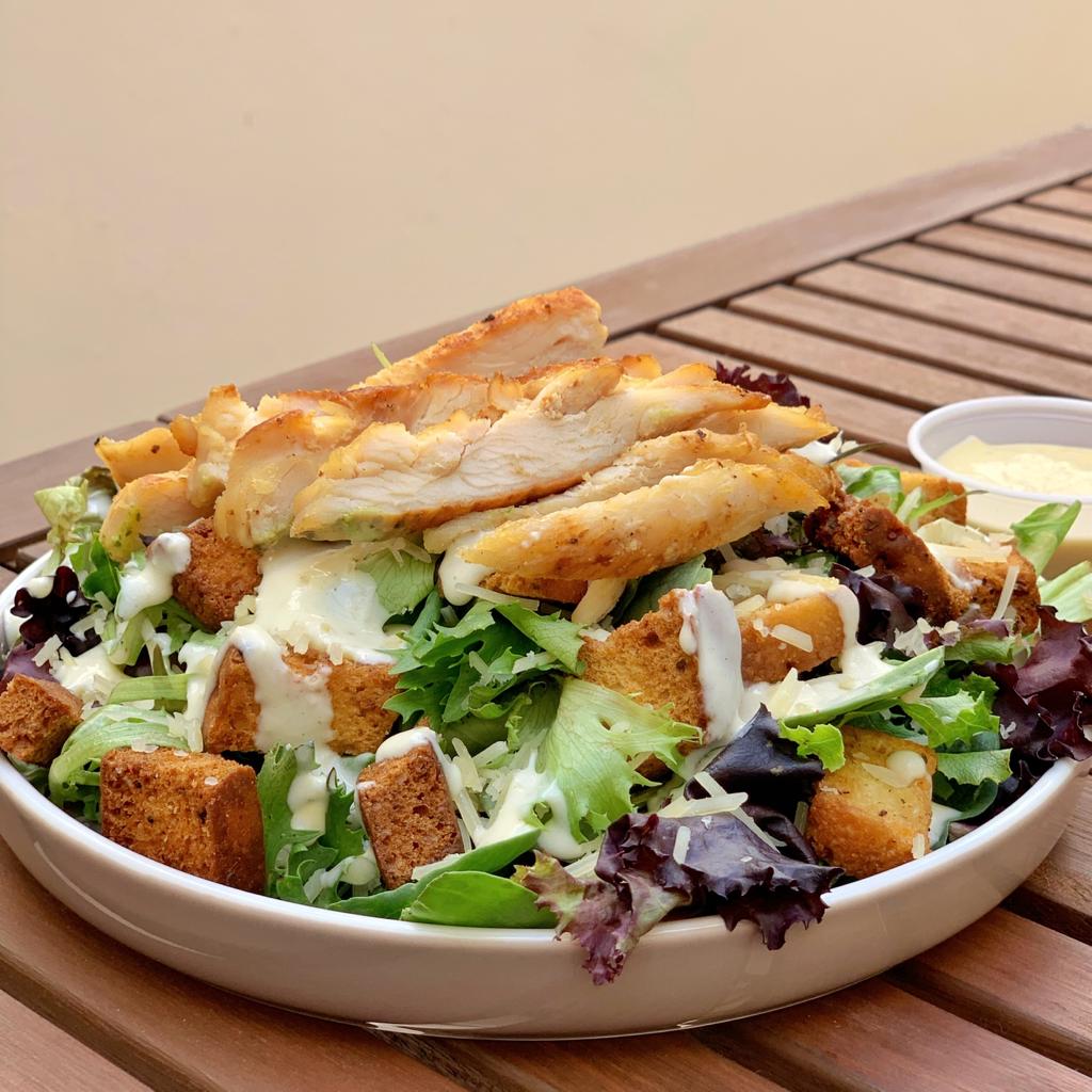 Mix de lechugas y espinaca, crotones de pan integral, parmesano, pechuga de pollo asada y aderezo César hecho en casa.