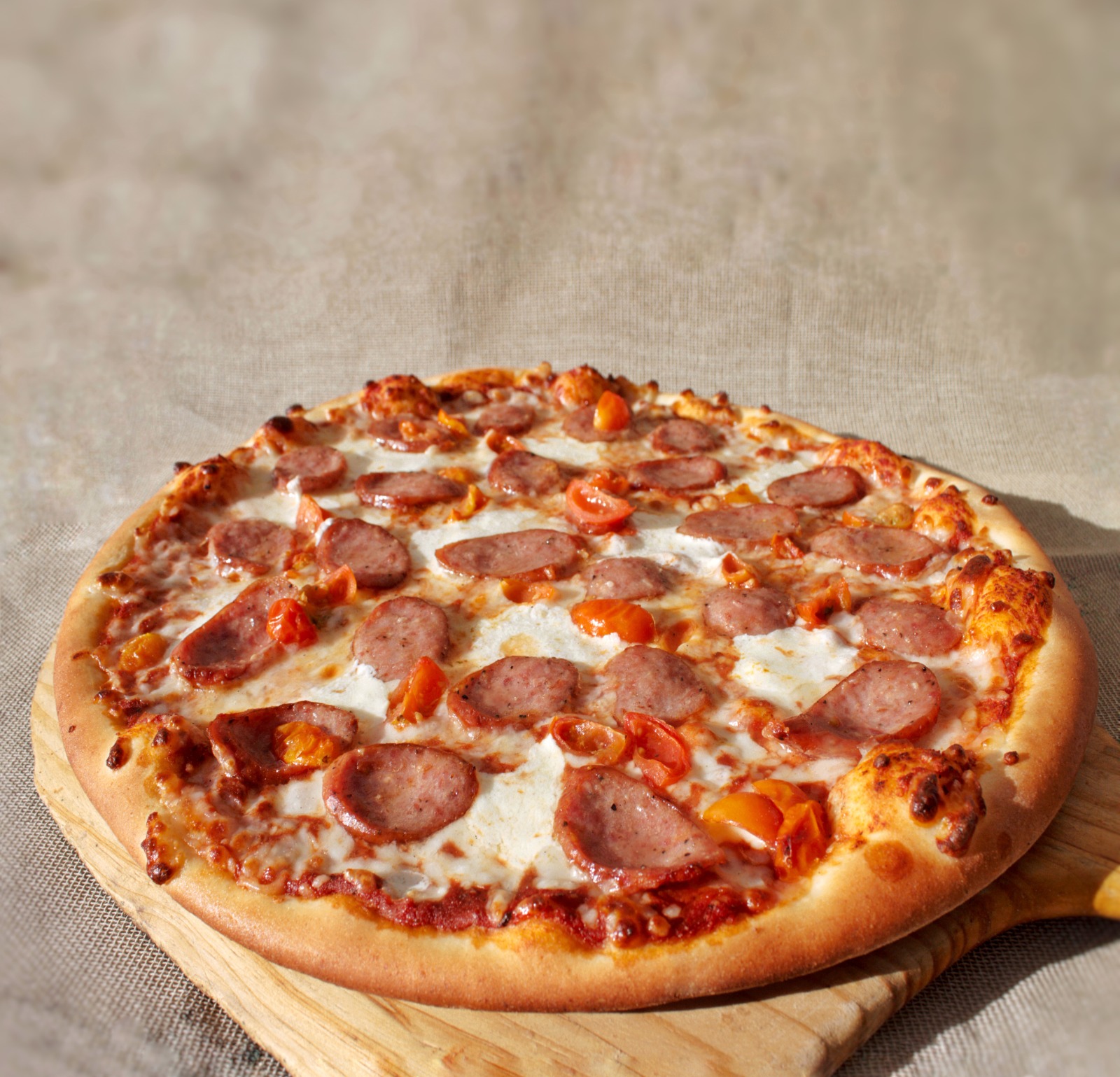 Mozzarella, salchicha ahumada con ajo, mozzarella fresco y tomate cherry.