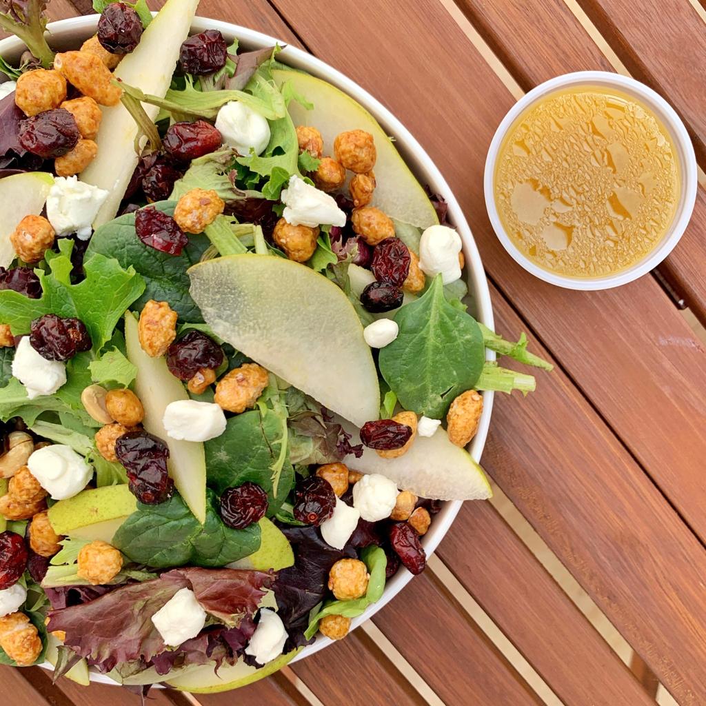 Mix de lechugas y espinaca, queso de cabra, pera, arándanos, cacahuate garapiñado y aderezo de maple hecho en casa.