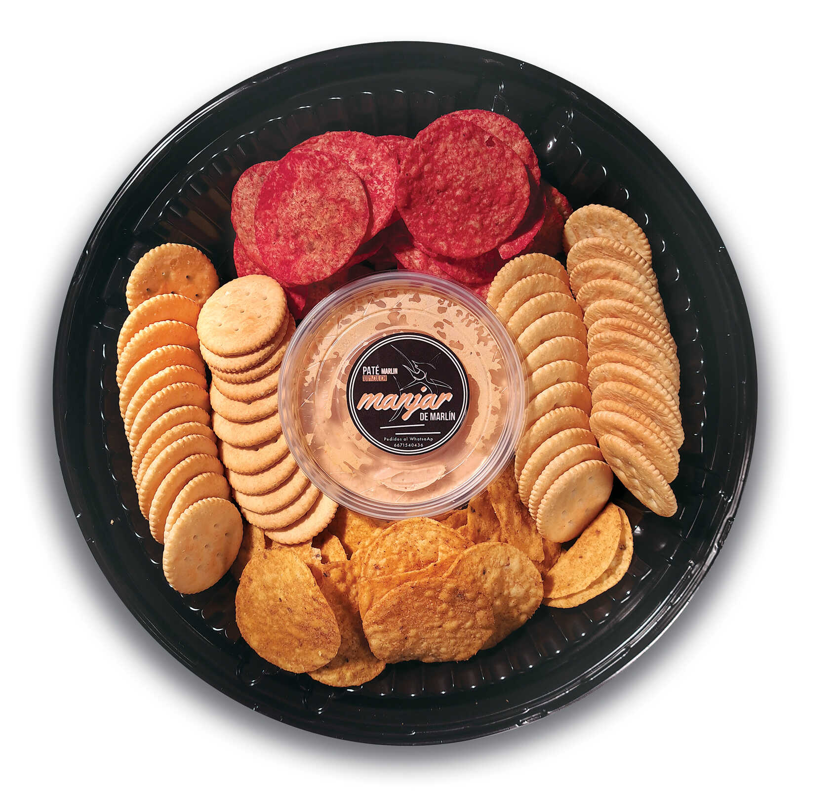 1/4 De paté de camarón o marlín, con galletas ritz, tostitos verdes y tostitos flaming.