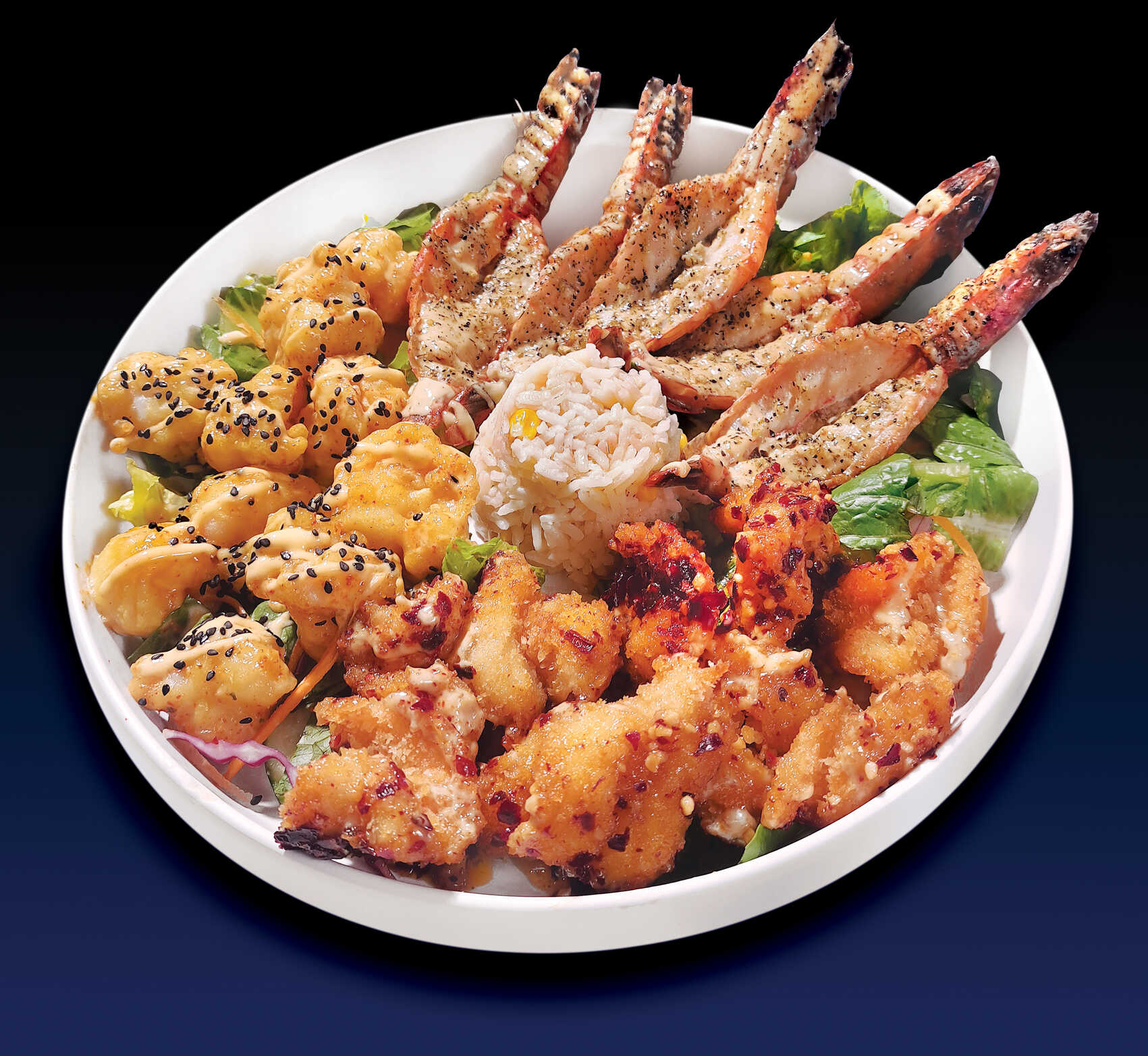 Camarón mixto a base de salsas negras, 80 g.